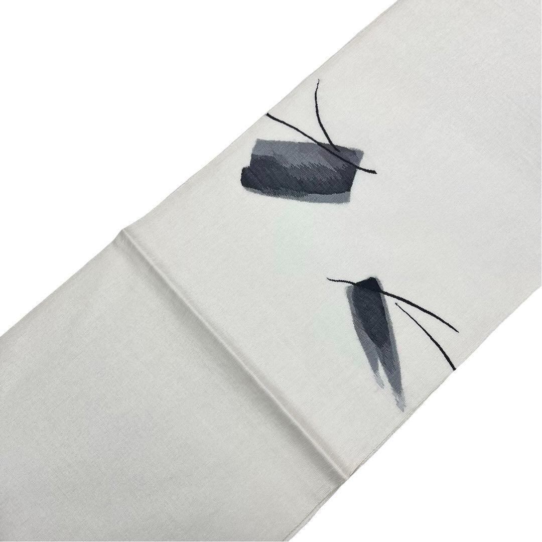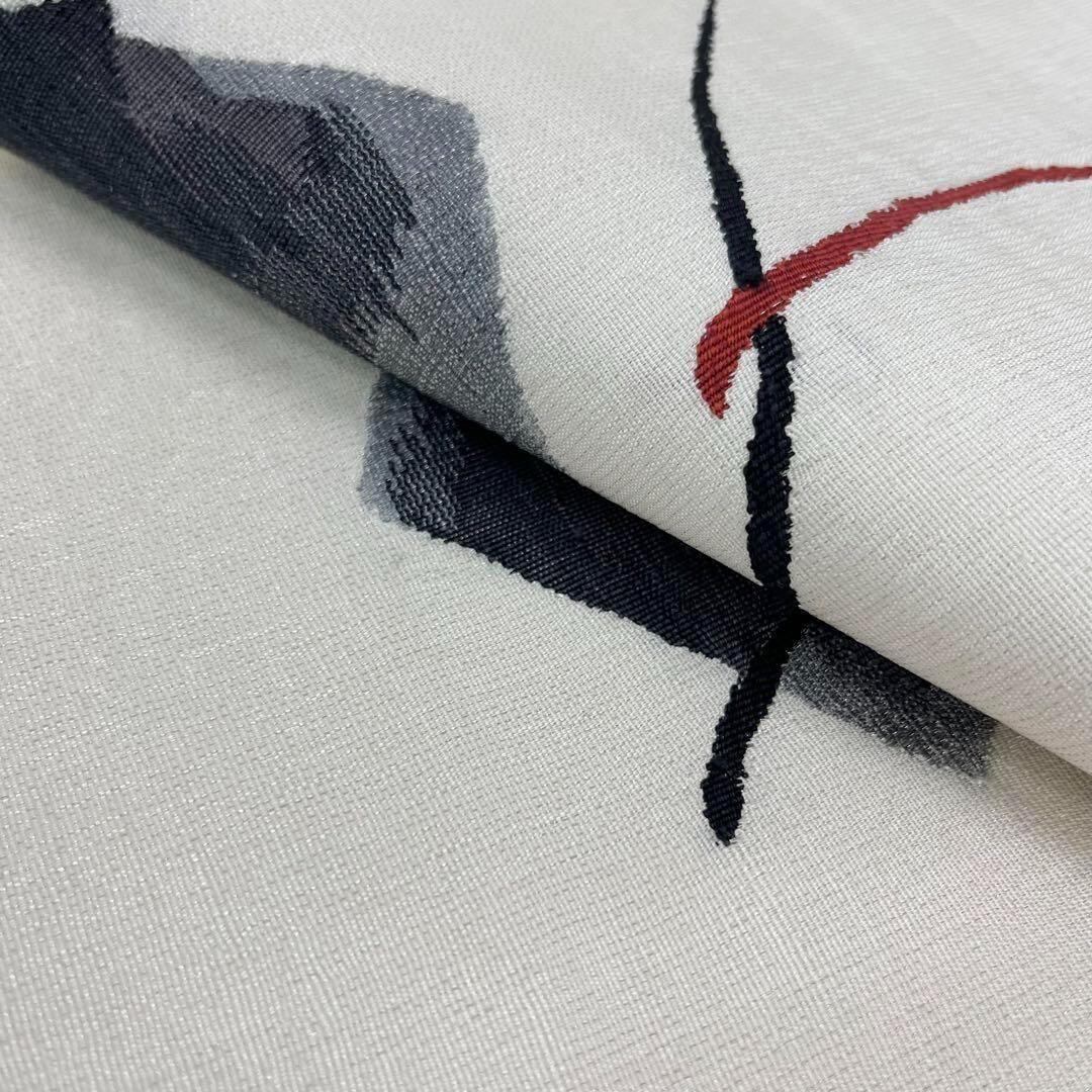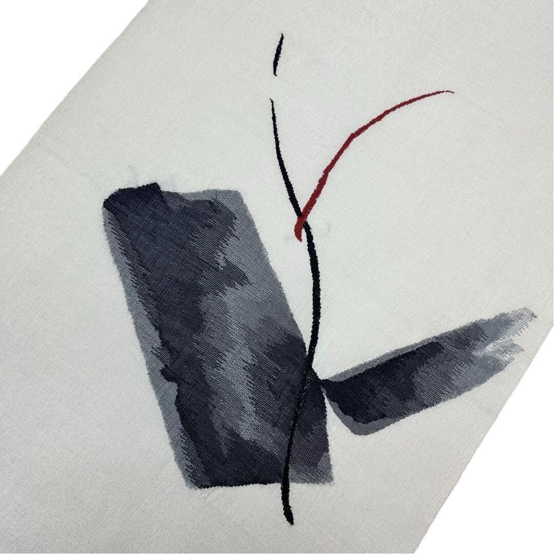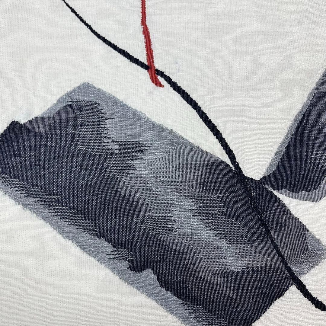 乳白色の上品なお色味、白と黒のハーモニー夢彩と題された品のある抽象模様がデザインされた手織りの素敵なお品でございます。