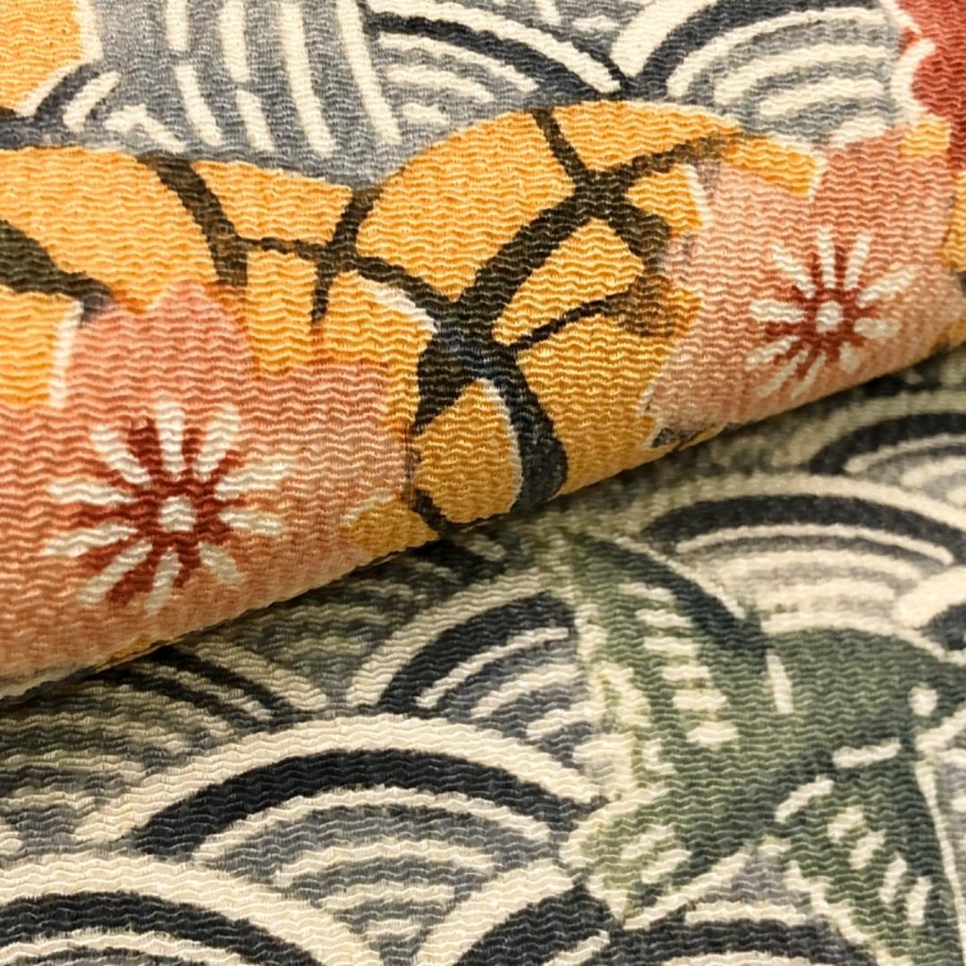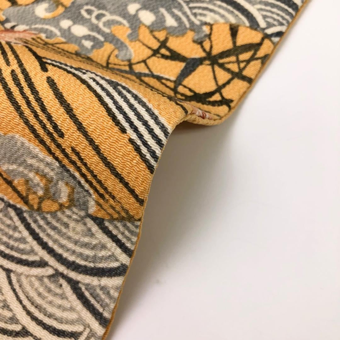 晒柿色のお色味の縮緬地に波模様に鳥、桜の花などがデザインされた雰囲気の良い素敵なお品でございます。