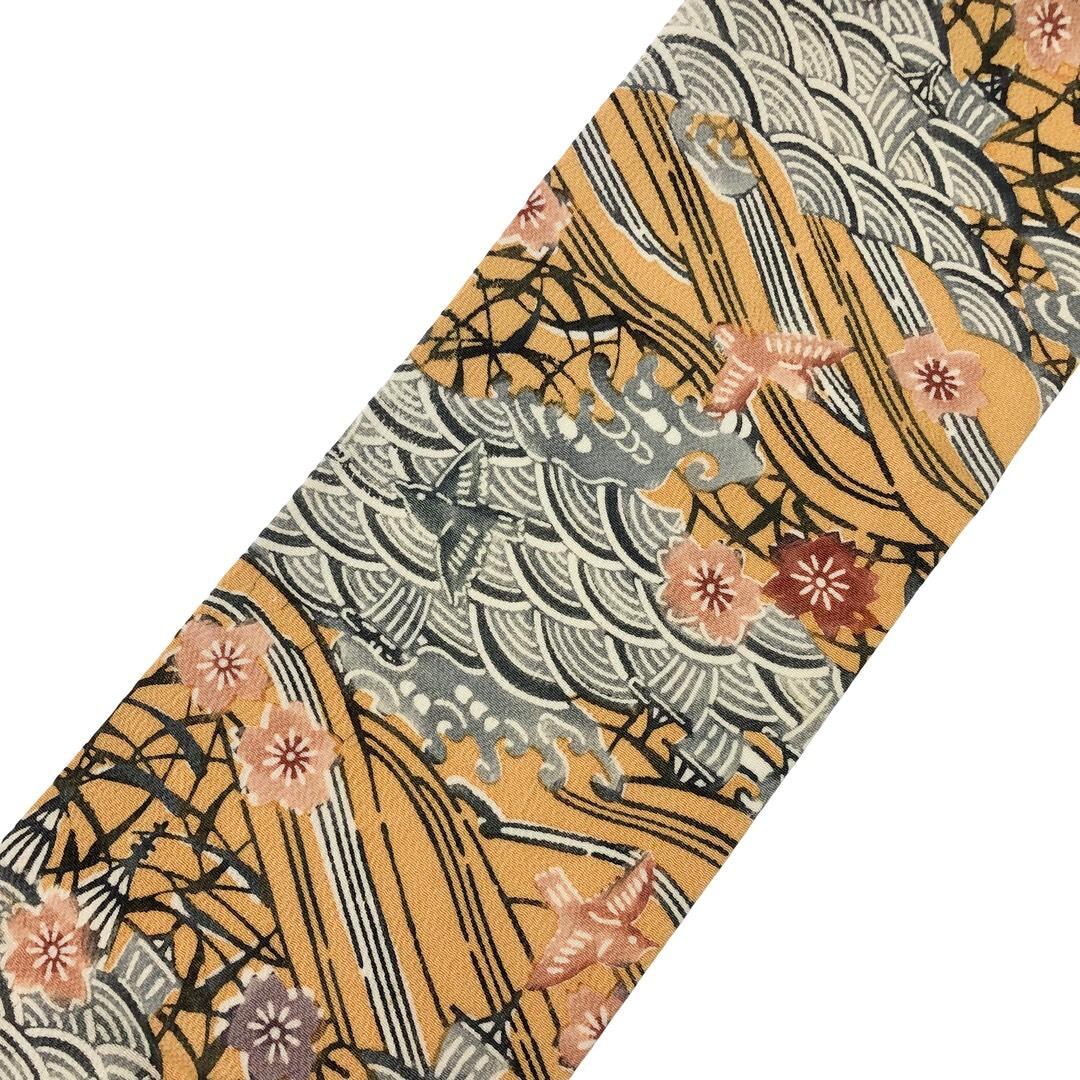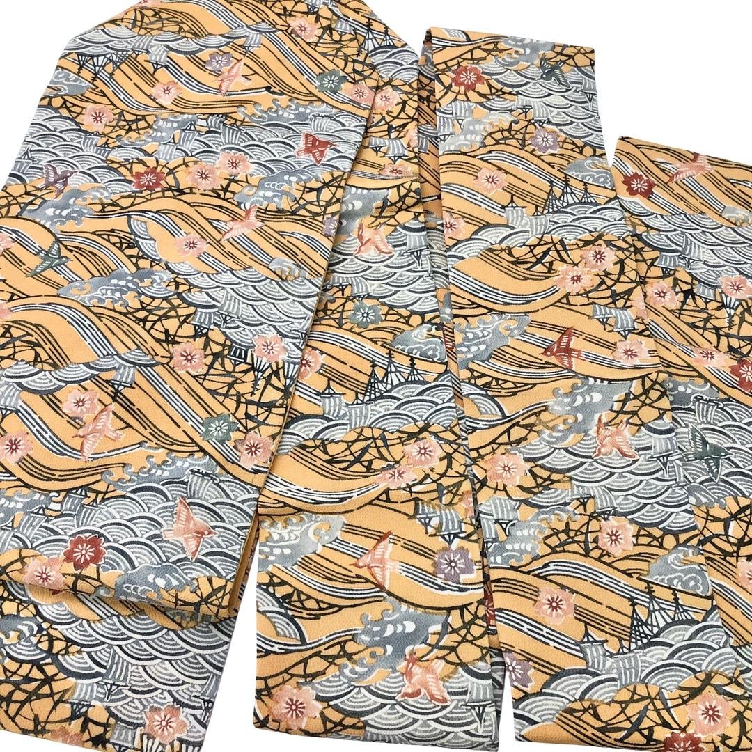 名古屋帯 型染 波模様に鳥 桜 晒柿色 縮緬 長尺 O-6164 着物 きもの kimono 和服 和装 中古 リサイクル着物 【送料無料】