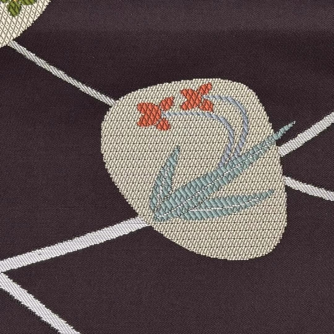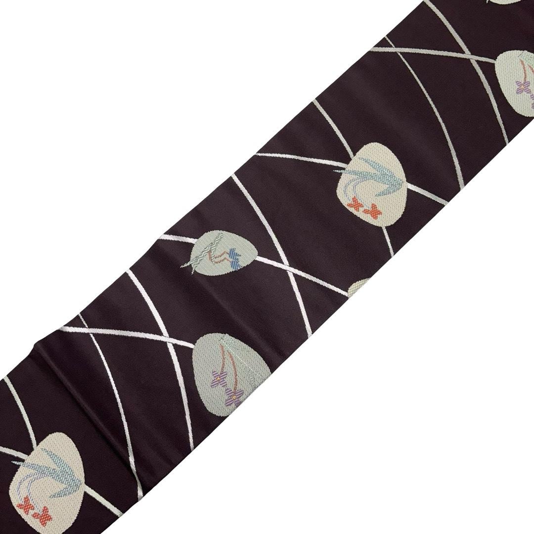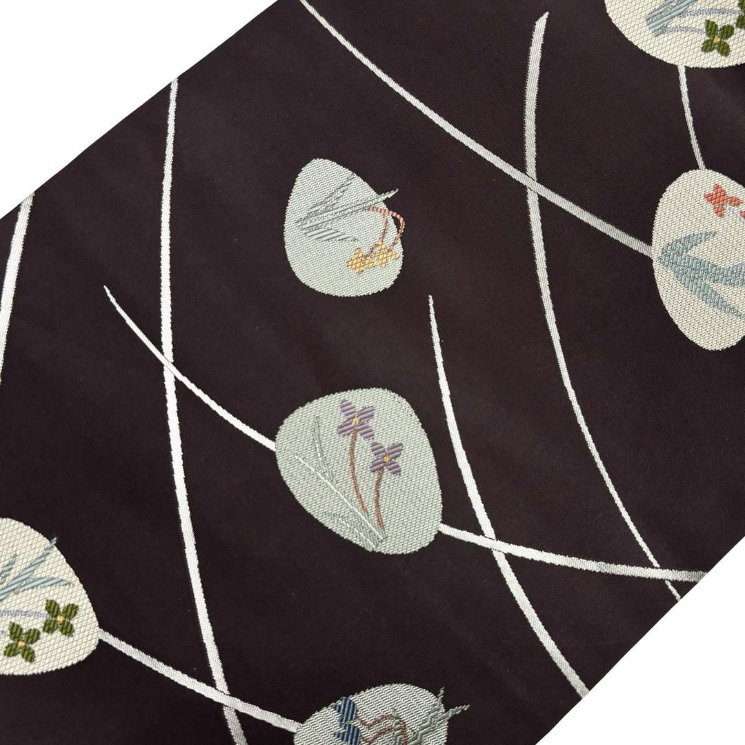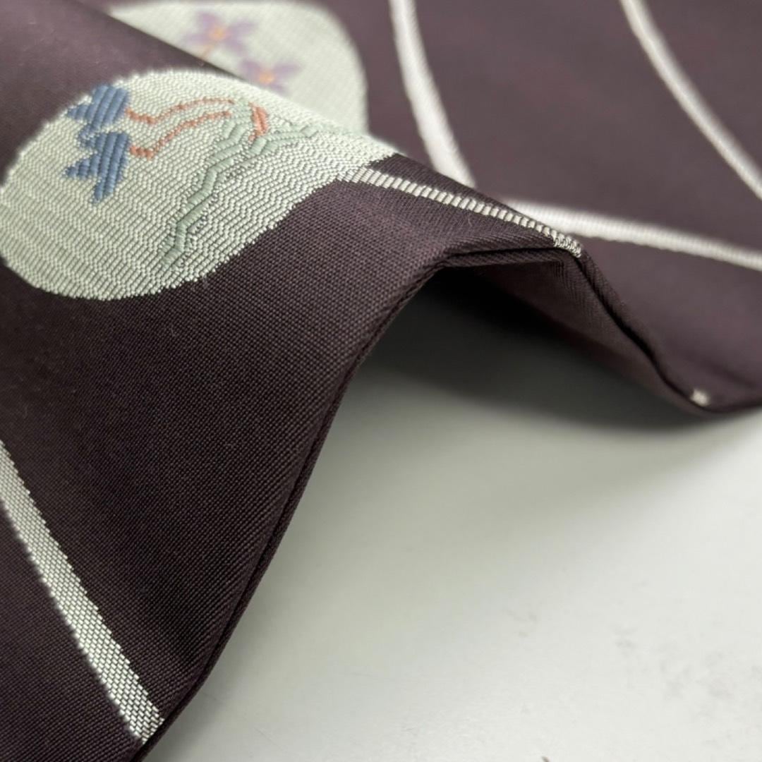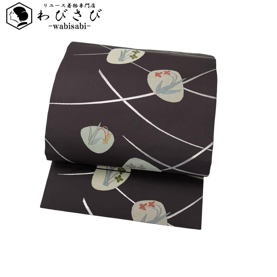 名古屋帯 貝に花柄 芝模様 銀糸 葡萄鼠色 O-6187 着物 きもの kimono 和服 和装 中古 リサイクル着物 【送料無料】