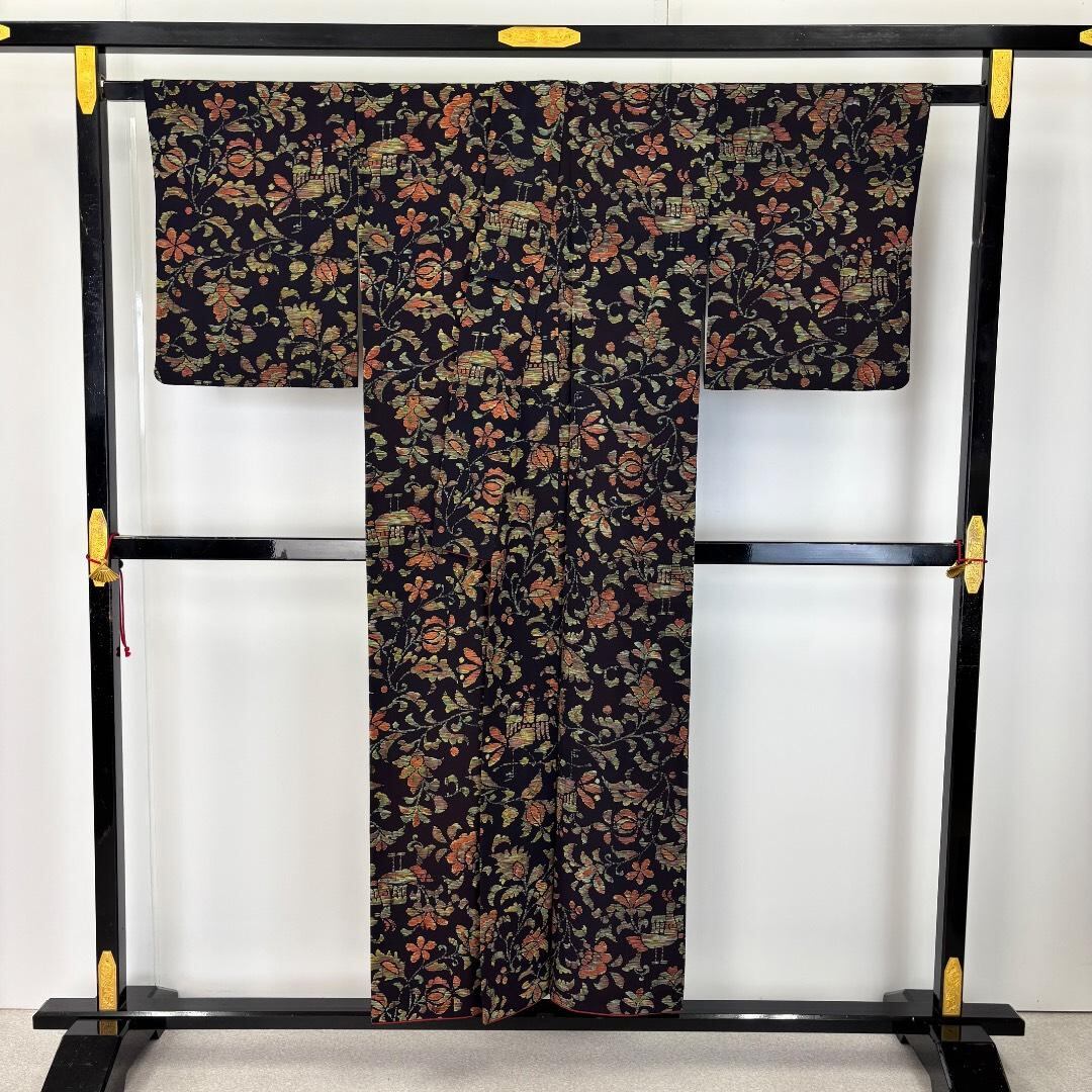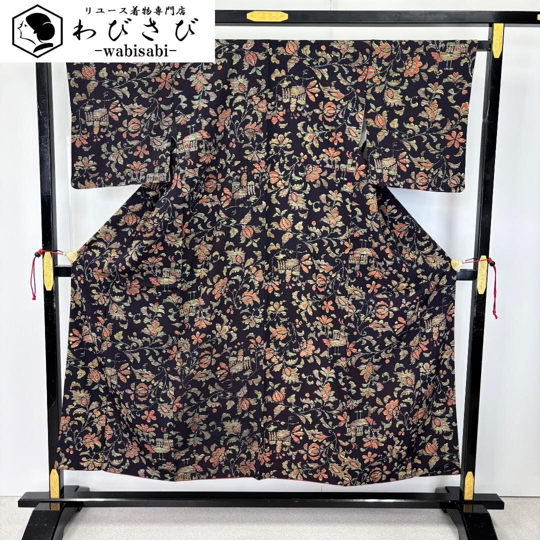小紋 花唐草模様 縮緬 紫黒色 K-5901 着物 きもの kimono 和服 和装 中古 リサイクル着物 【送料無料】