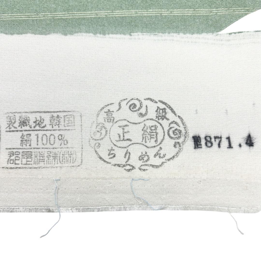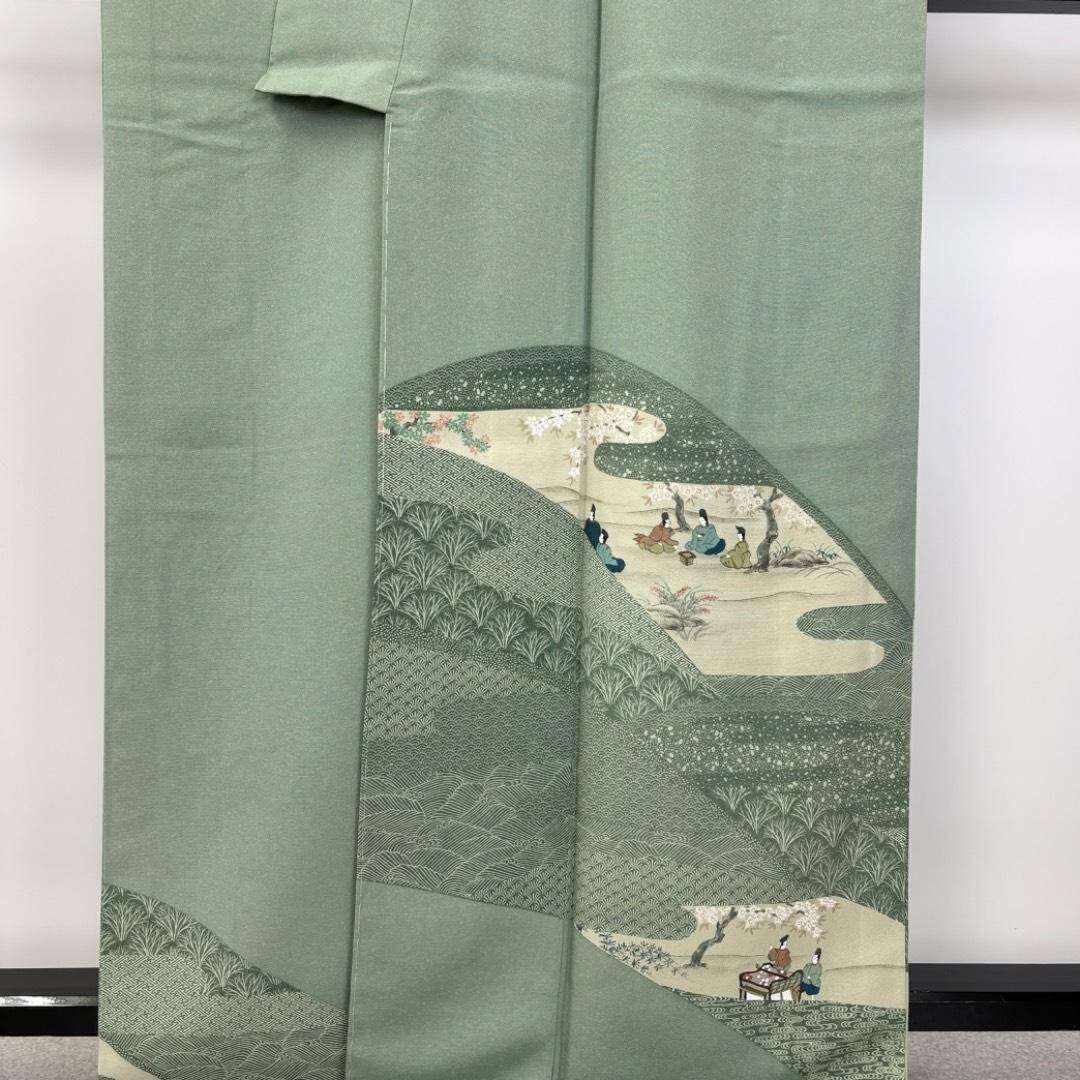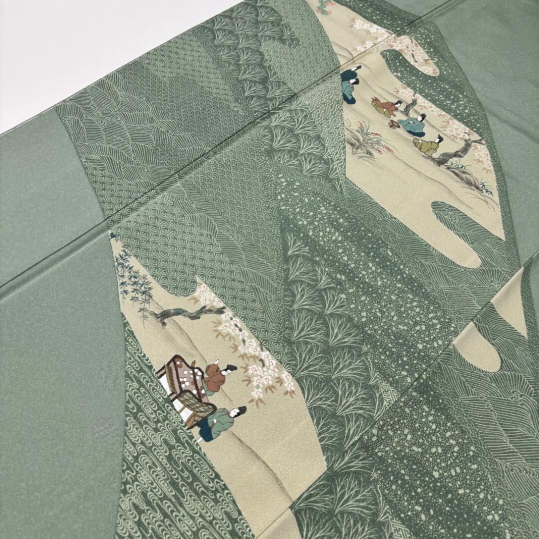 青磁色のお色味に遠山に人物柄がデザインされた素敵な柄裄のお品でございます。