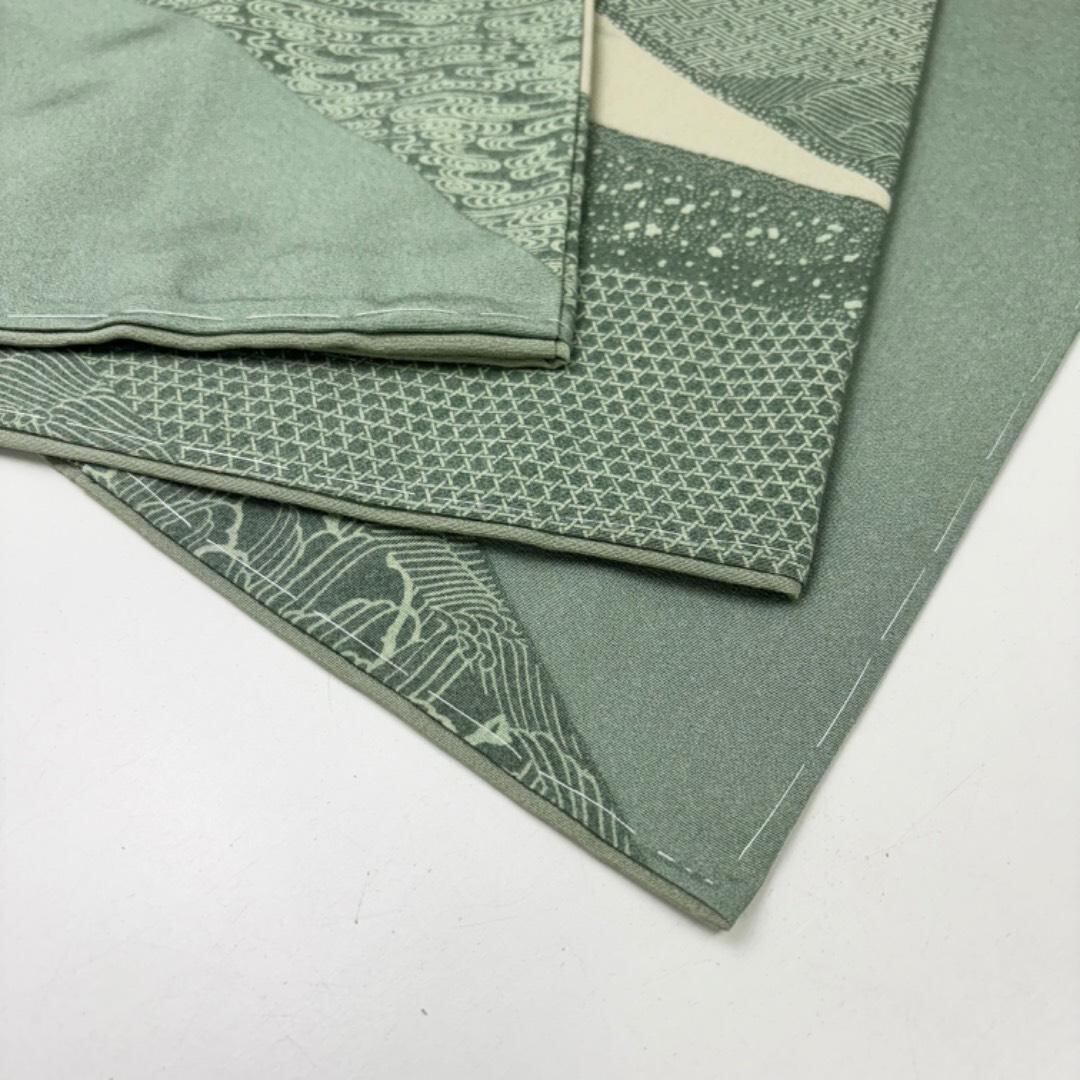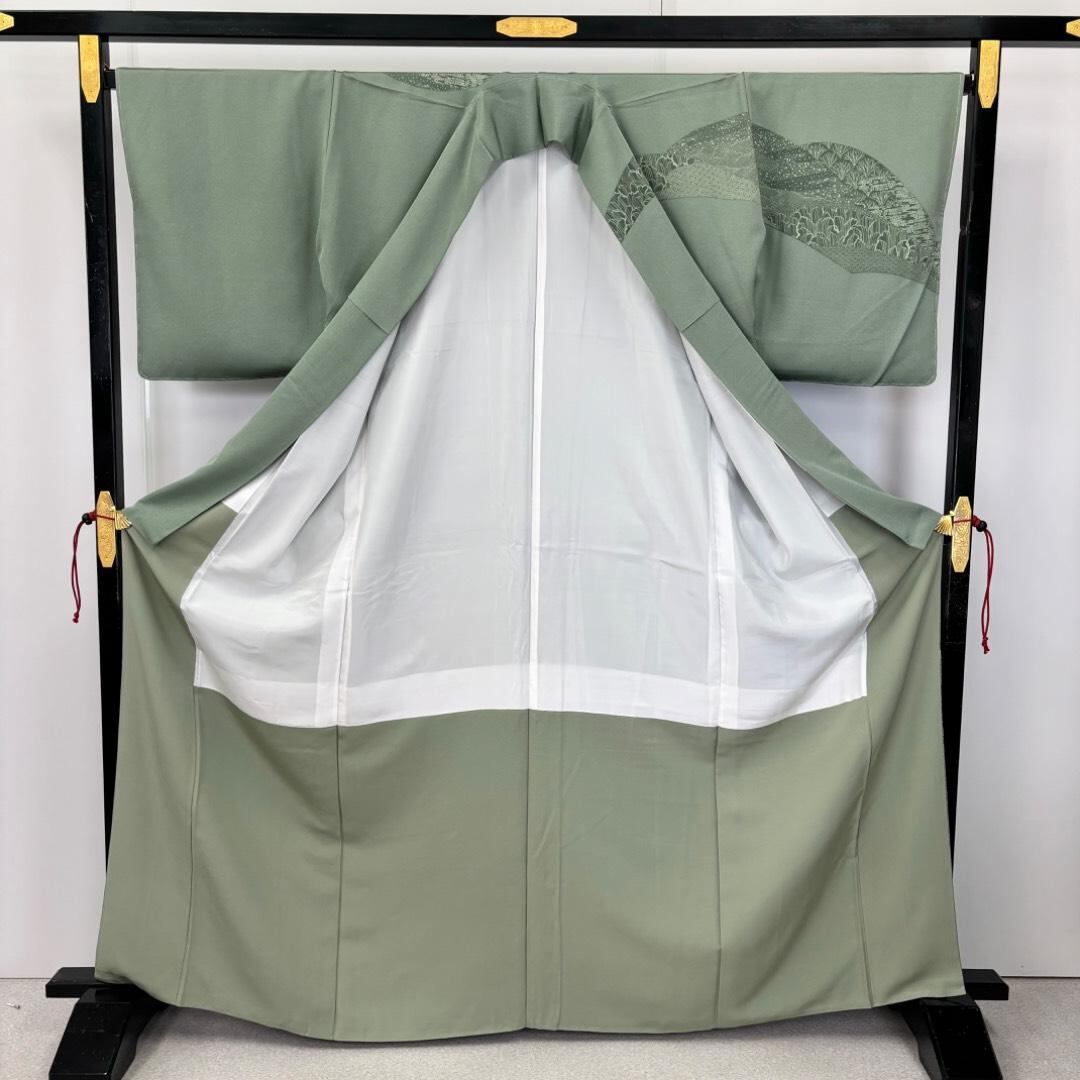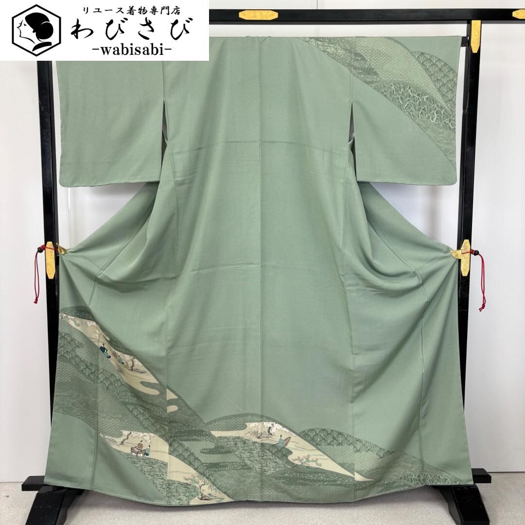 訪問着 遠山に人物柄 縮緬 青磁色 しつけ糸 トールサイズ K-5907 着物 きもの kimono 和服 和装 中古 リサイクル着物 【送料無料】