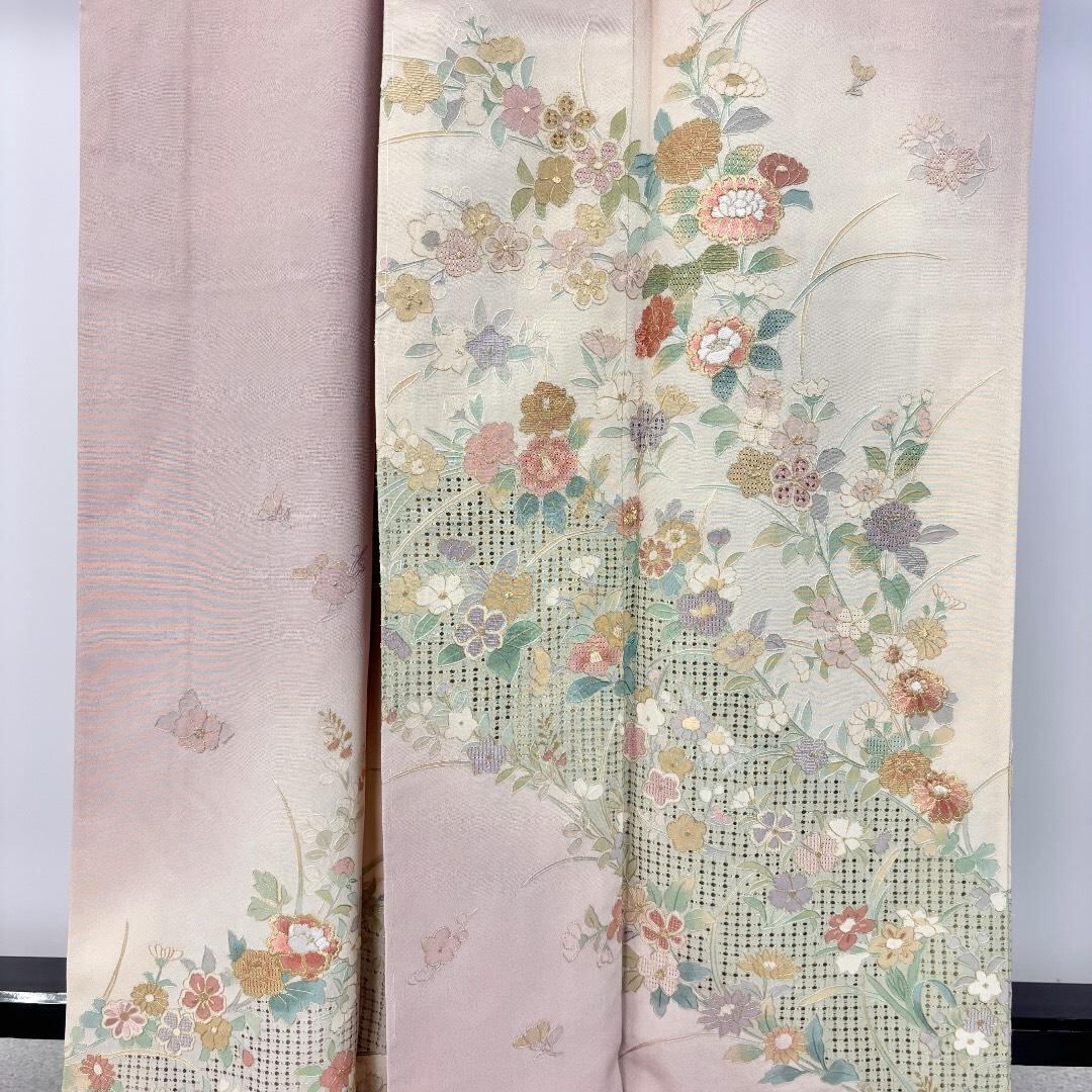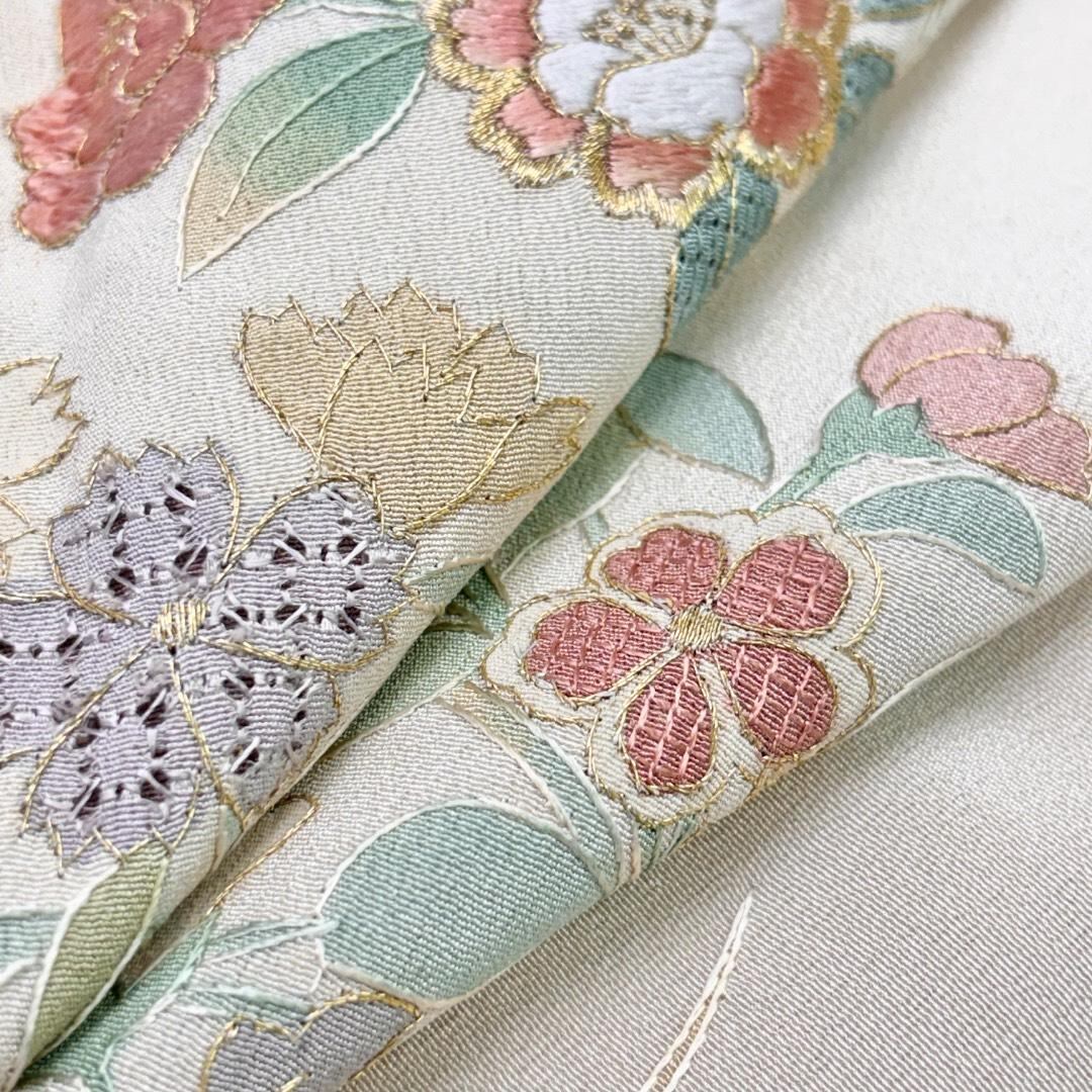 紅鼠色のお色味に暈し総刺繍の美しい花模様がデザインされた雰囲気の良い素敵なお品でございます。