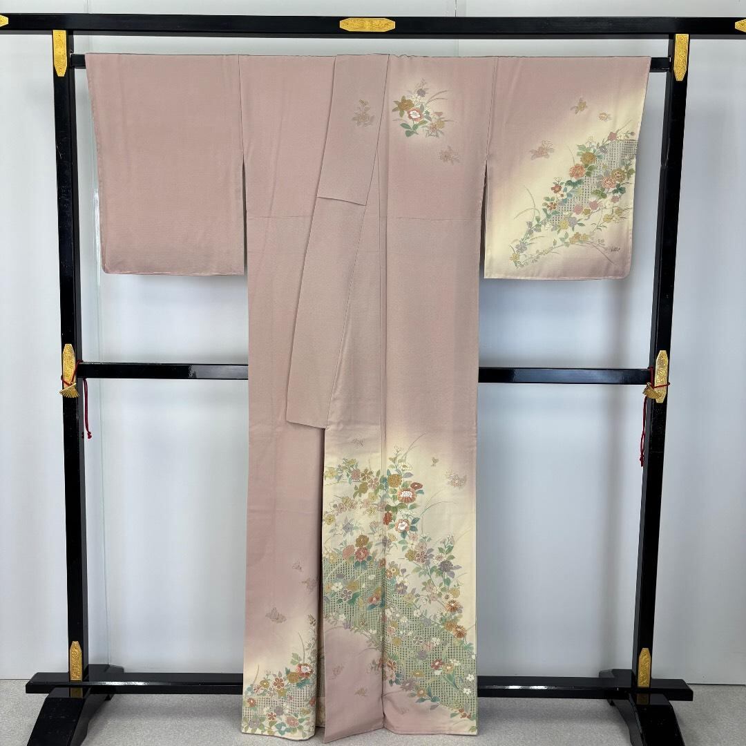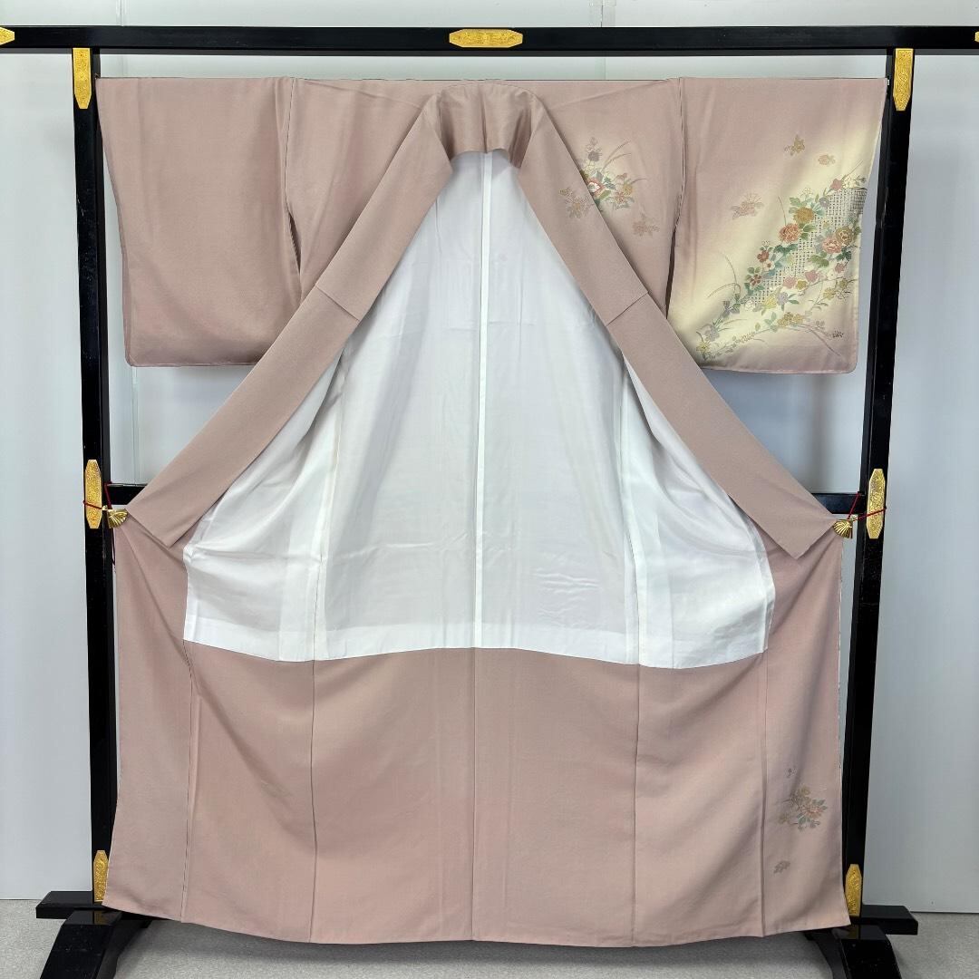 訪問着 作家物 汕頭刺繍 花模様 金糸 紅鼠色 しつけ糸 K-5902 着物 きもの kimono 和服 和装 中古 リサイクル着物 【送料無料】