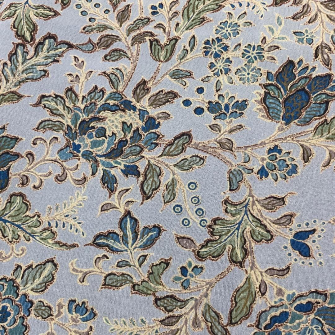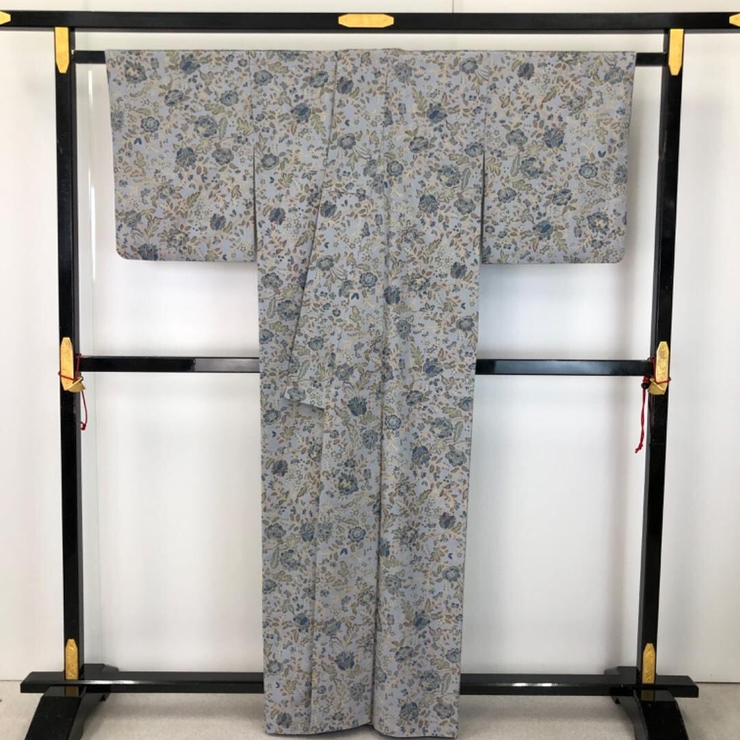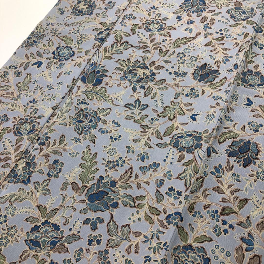 薄藍色のお色味に花唐草模様の柄裄がデザインされた雰囲気の良い素敵なお品でございます。