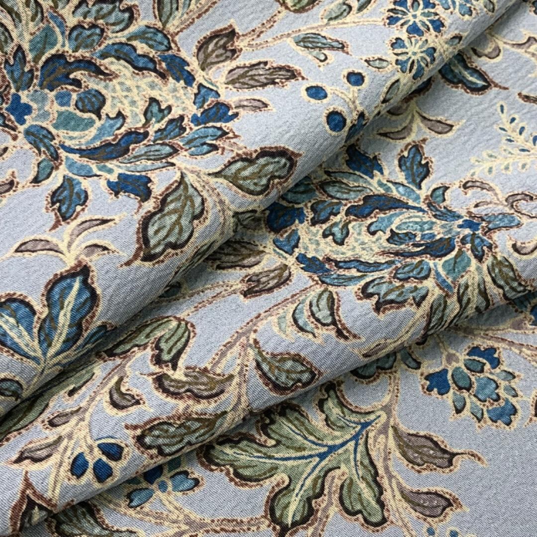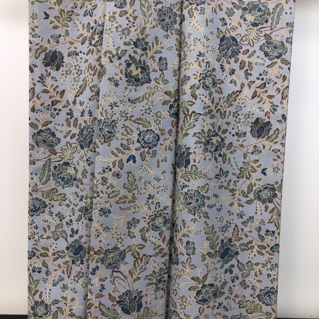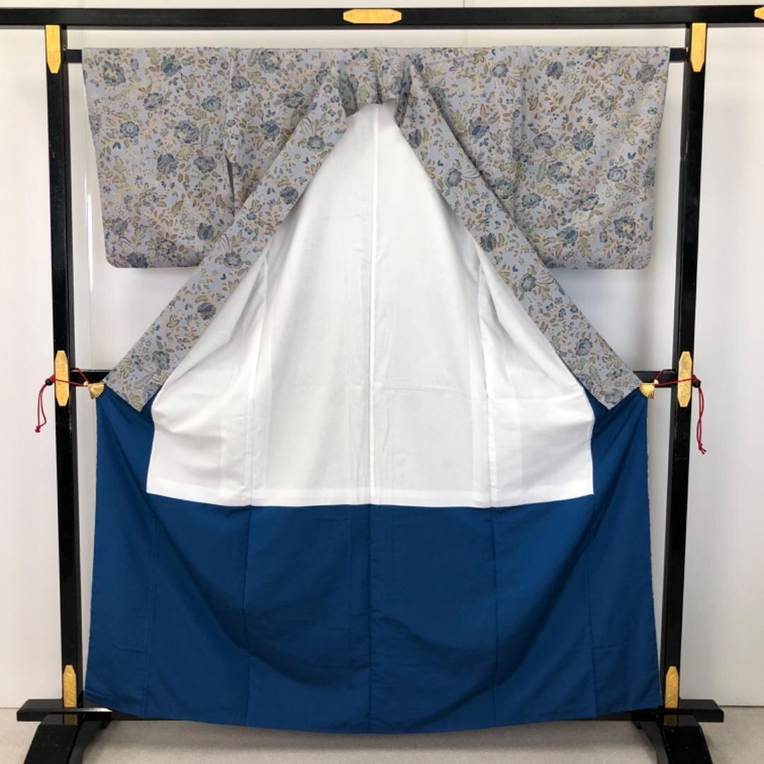 薄藍色のお色味に花唐草模様の柄裄がデザインされた雰囲気の良い素敵なお品でございます。