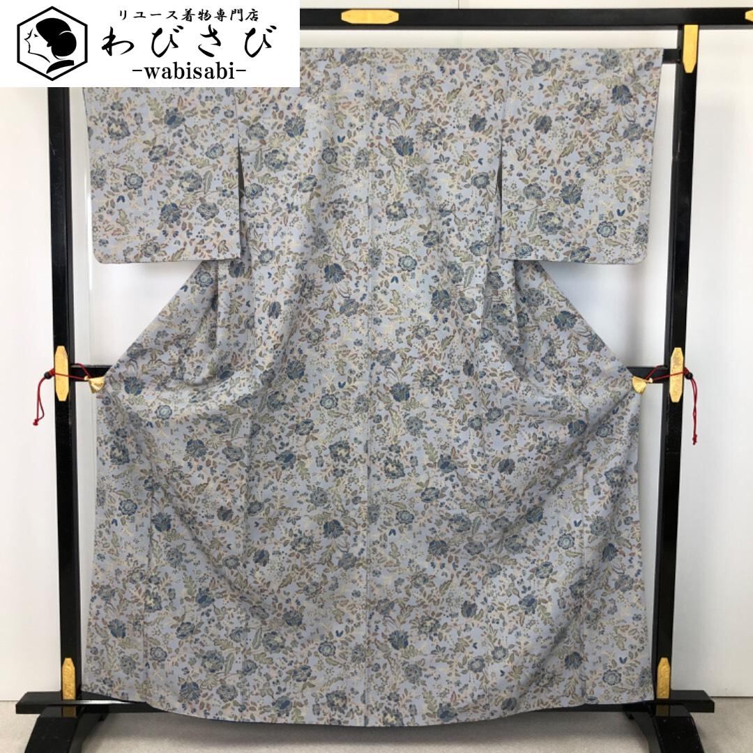 小紋 花唐草模様 薄藍色 縮緬 K-5912 着物 きもの kimono 和服 和装 中古 リサイクル着物 【送料無料】