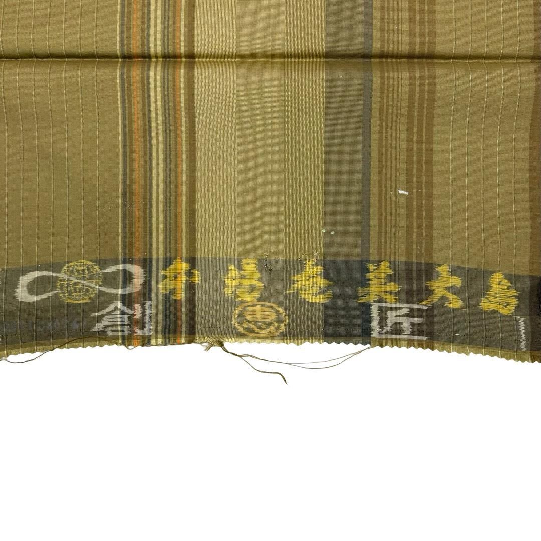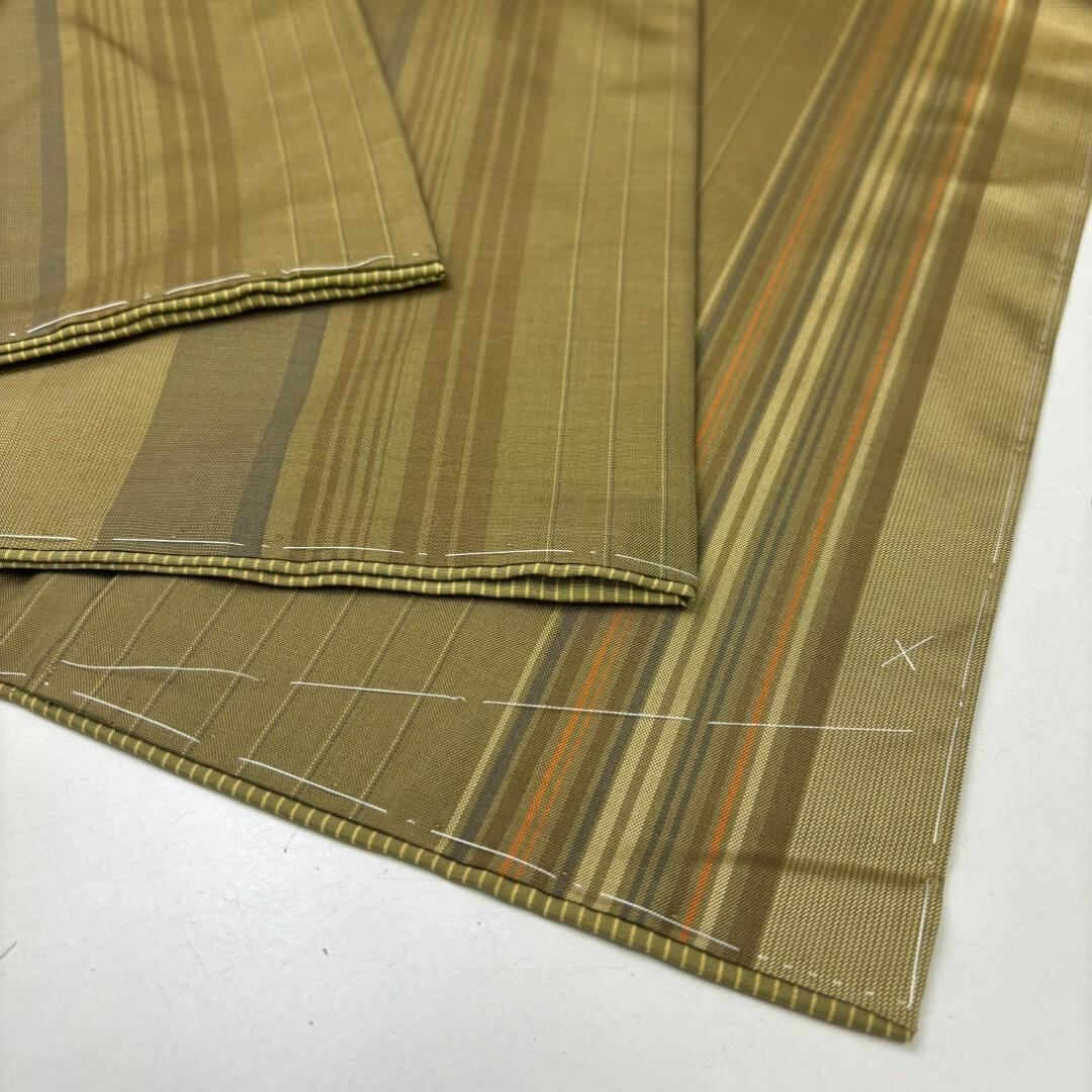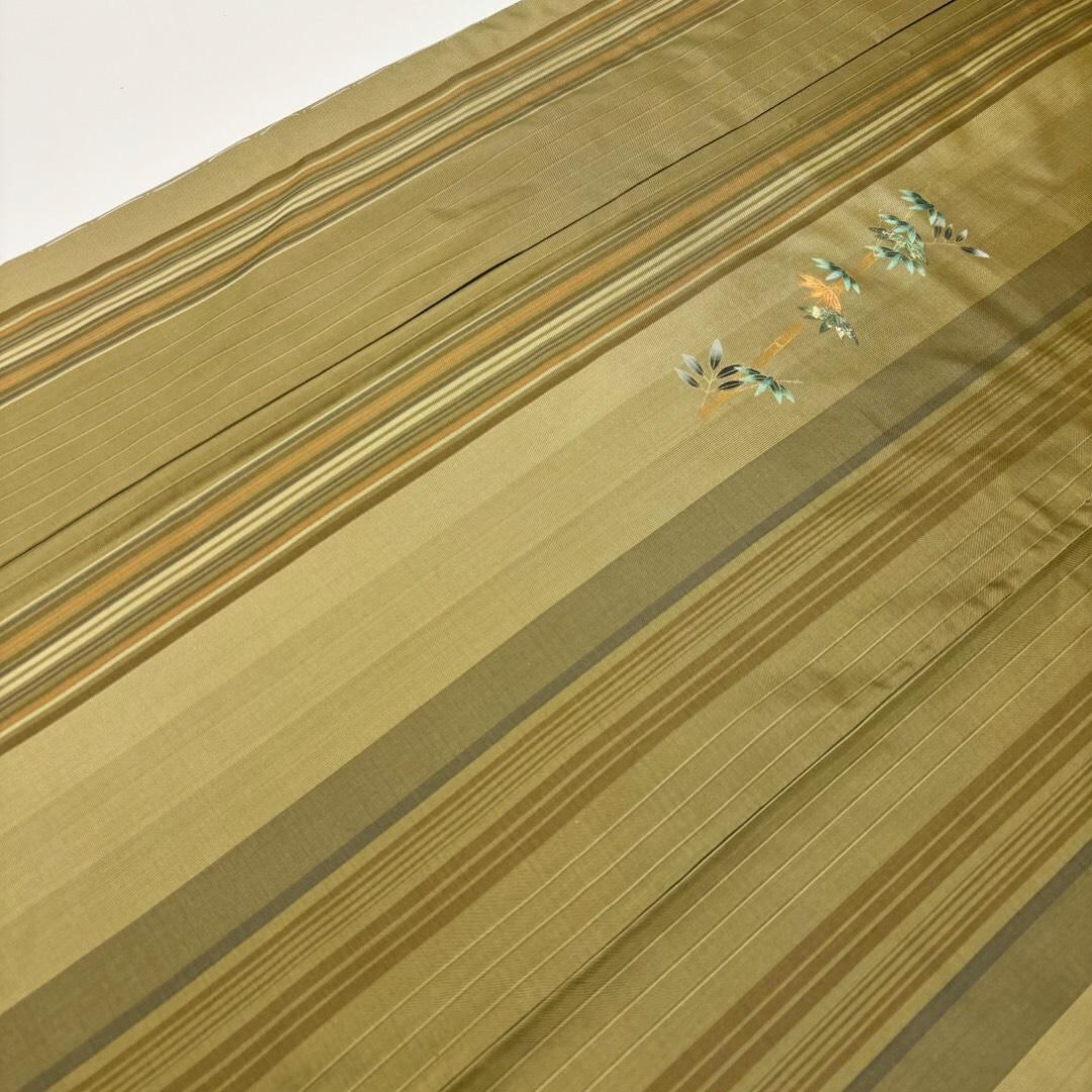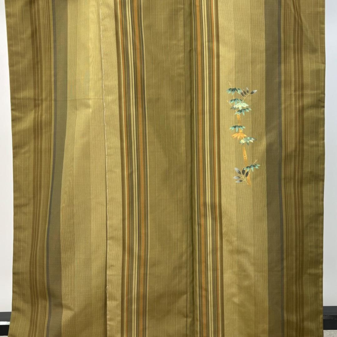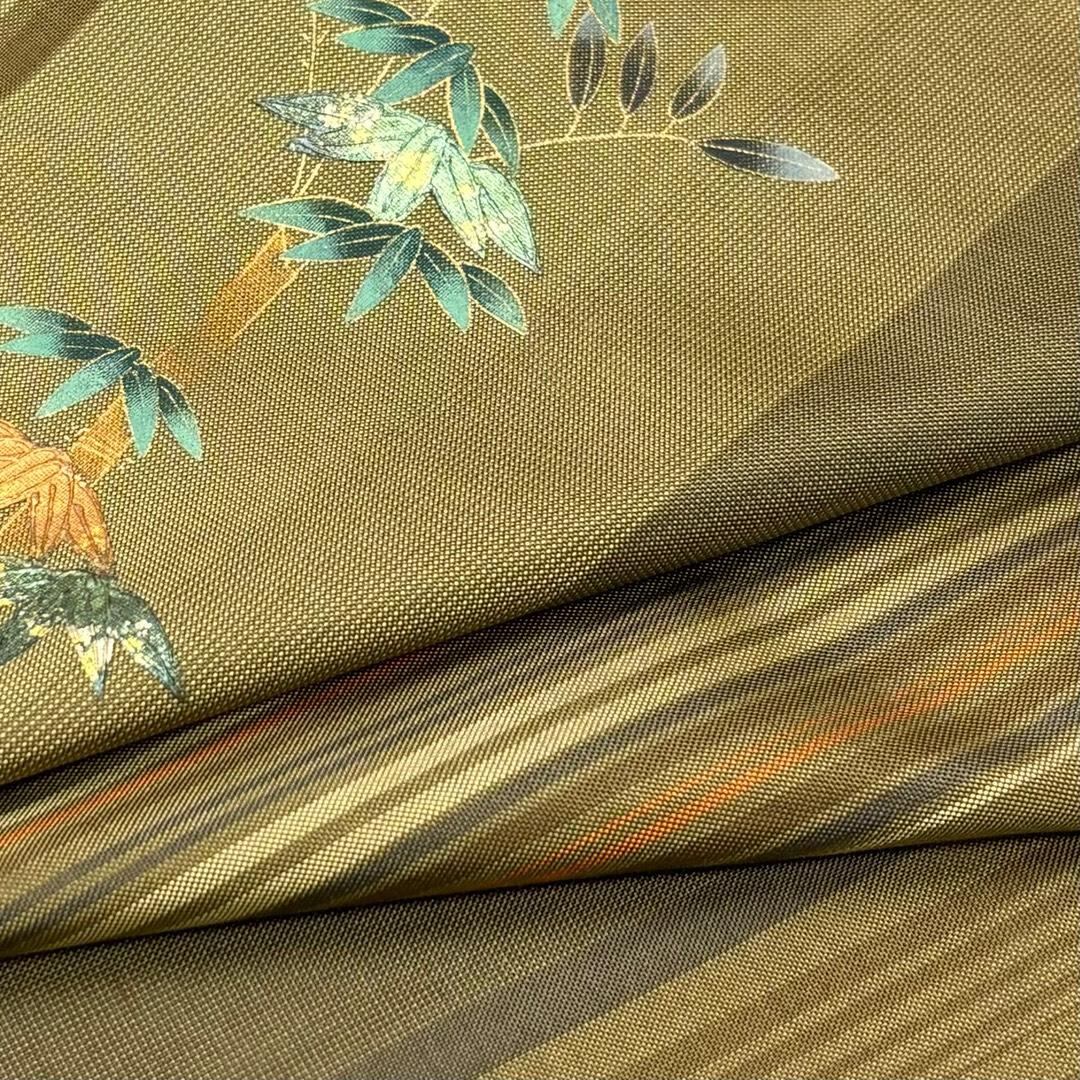 市紅茶色のお色味に縦縞模様、竹柄がデザインされた雰囲気の良い素敵な柄裄のお品でございます。