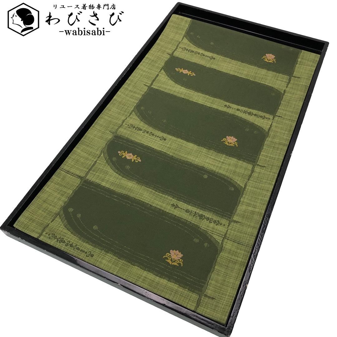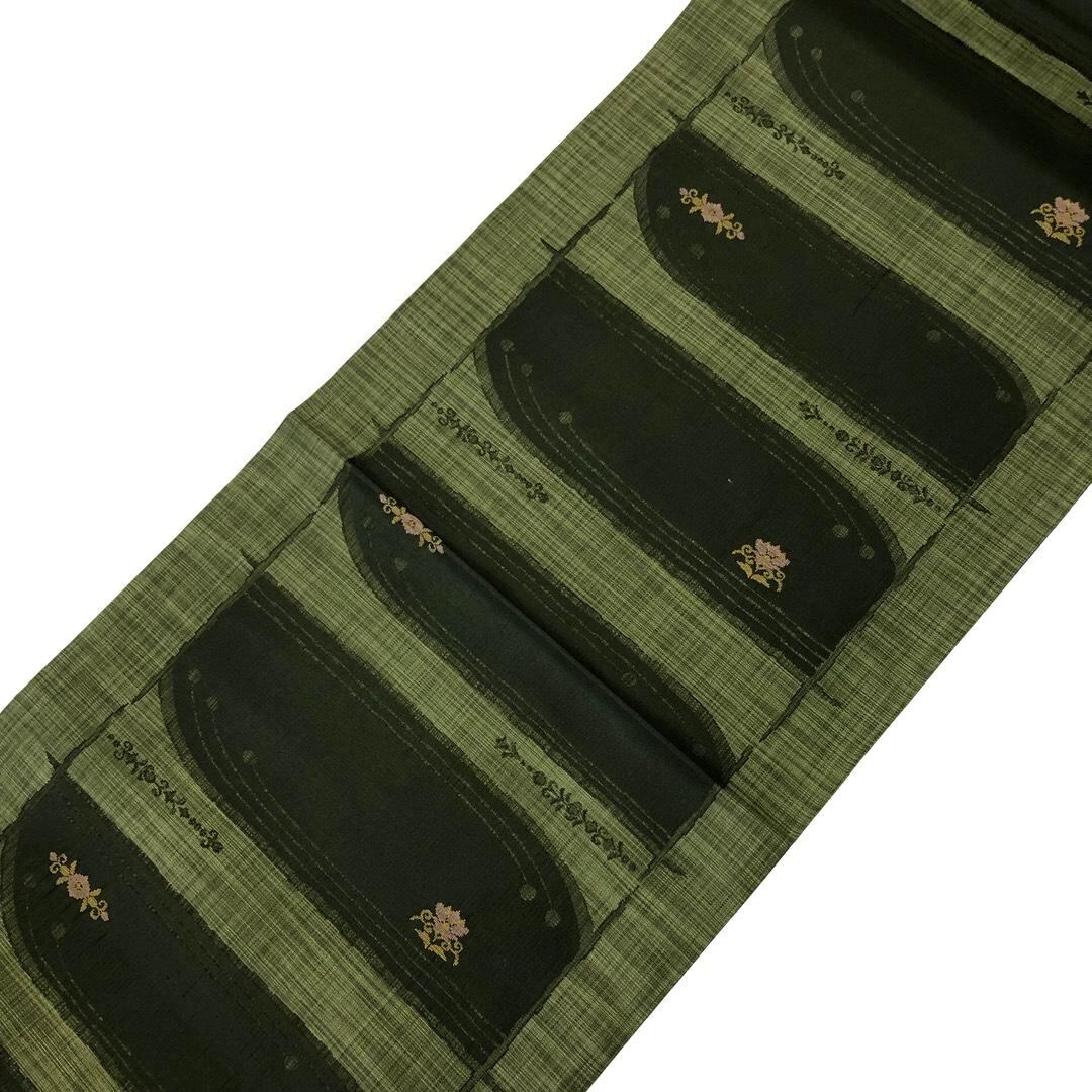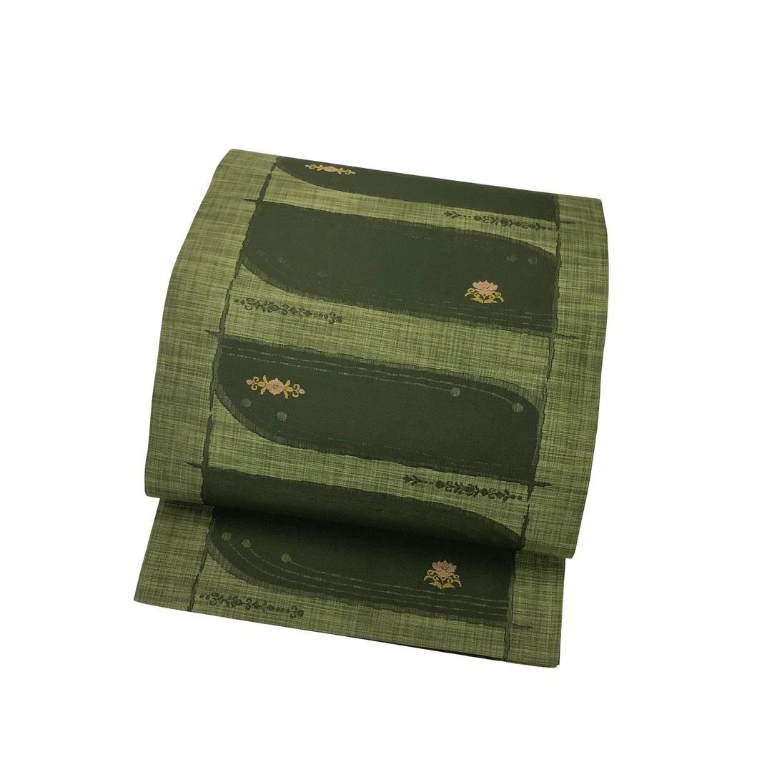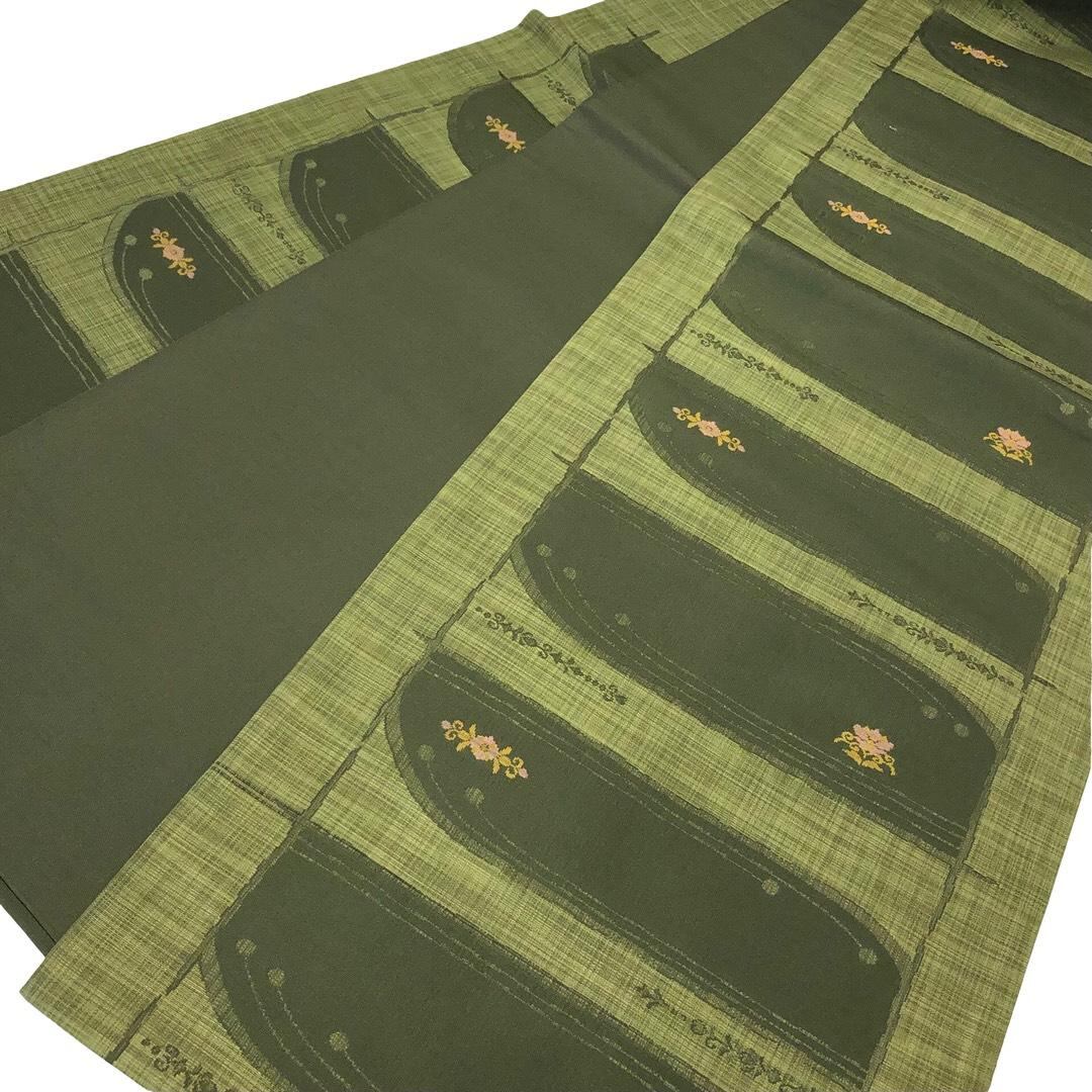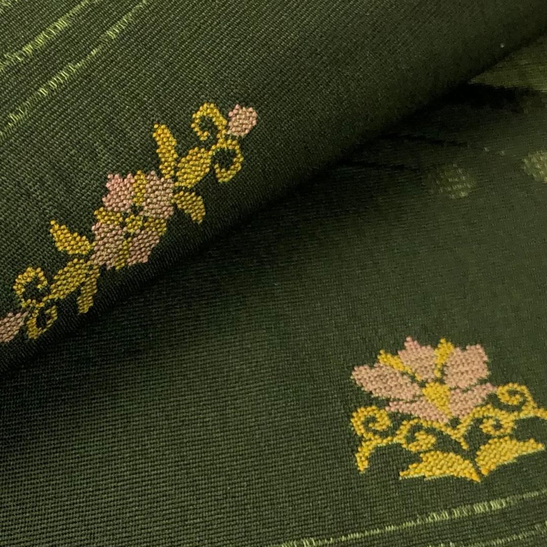 昆布茶色ベースの緑味のお色に横段模様、小花柄がデザインされた素敵なお品でございます。