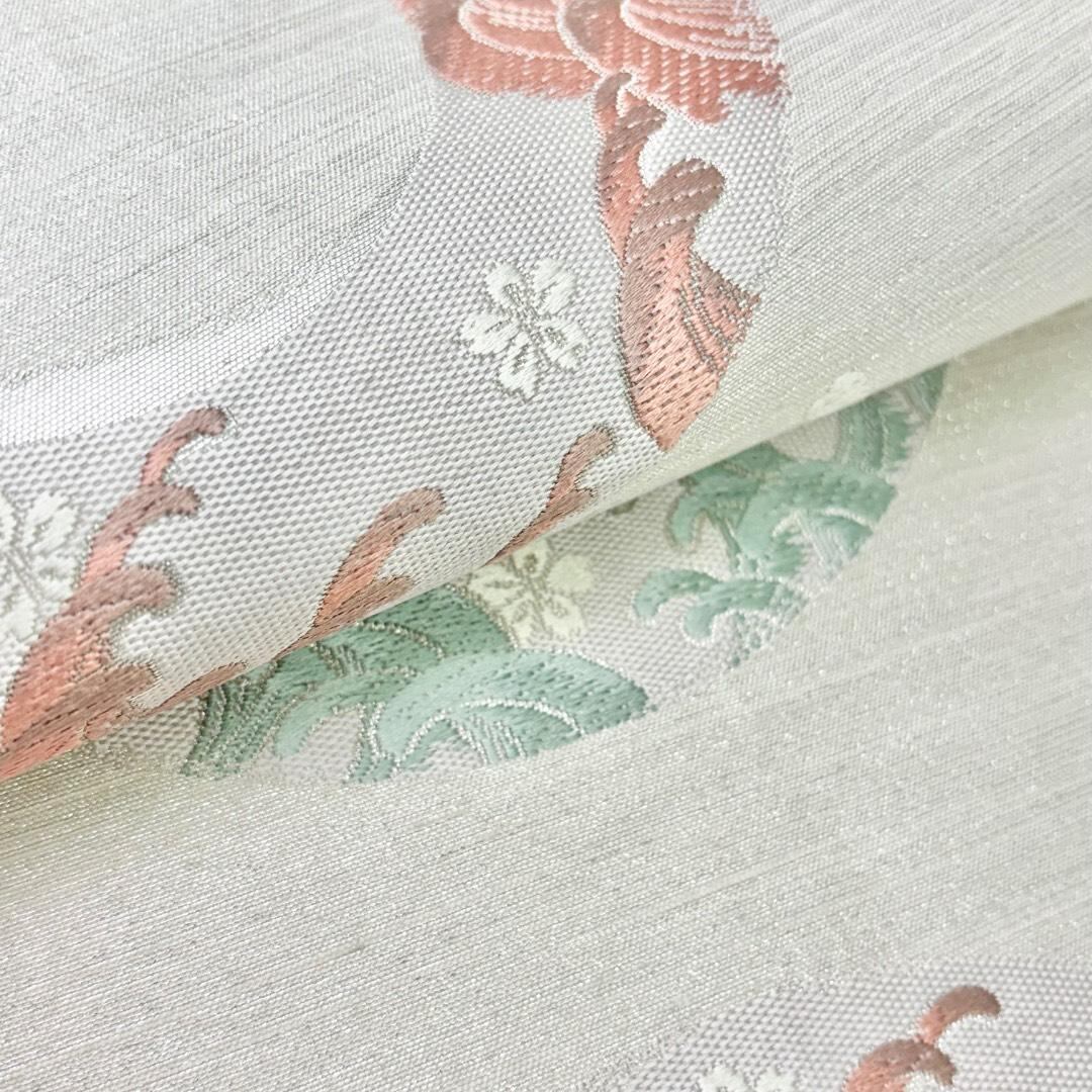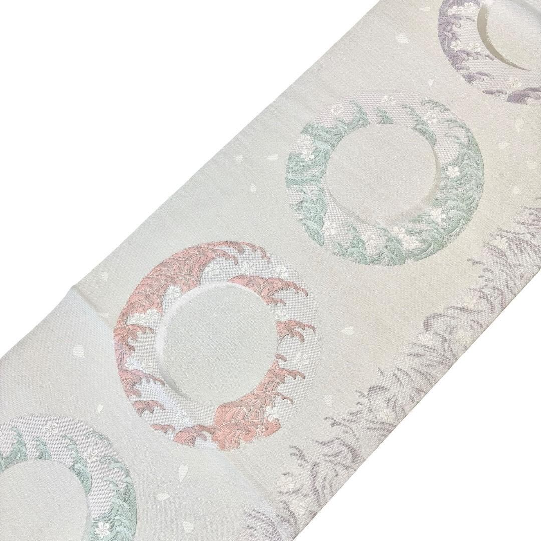 袋帯 丸に波模様 花柄 銀糸 乳白色 O-6201 着物 きもの kimono 和服 和装 中古 リサイクル着物 【送料無料】