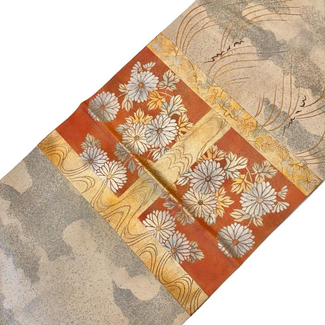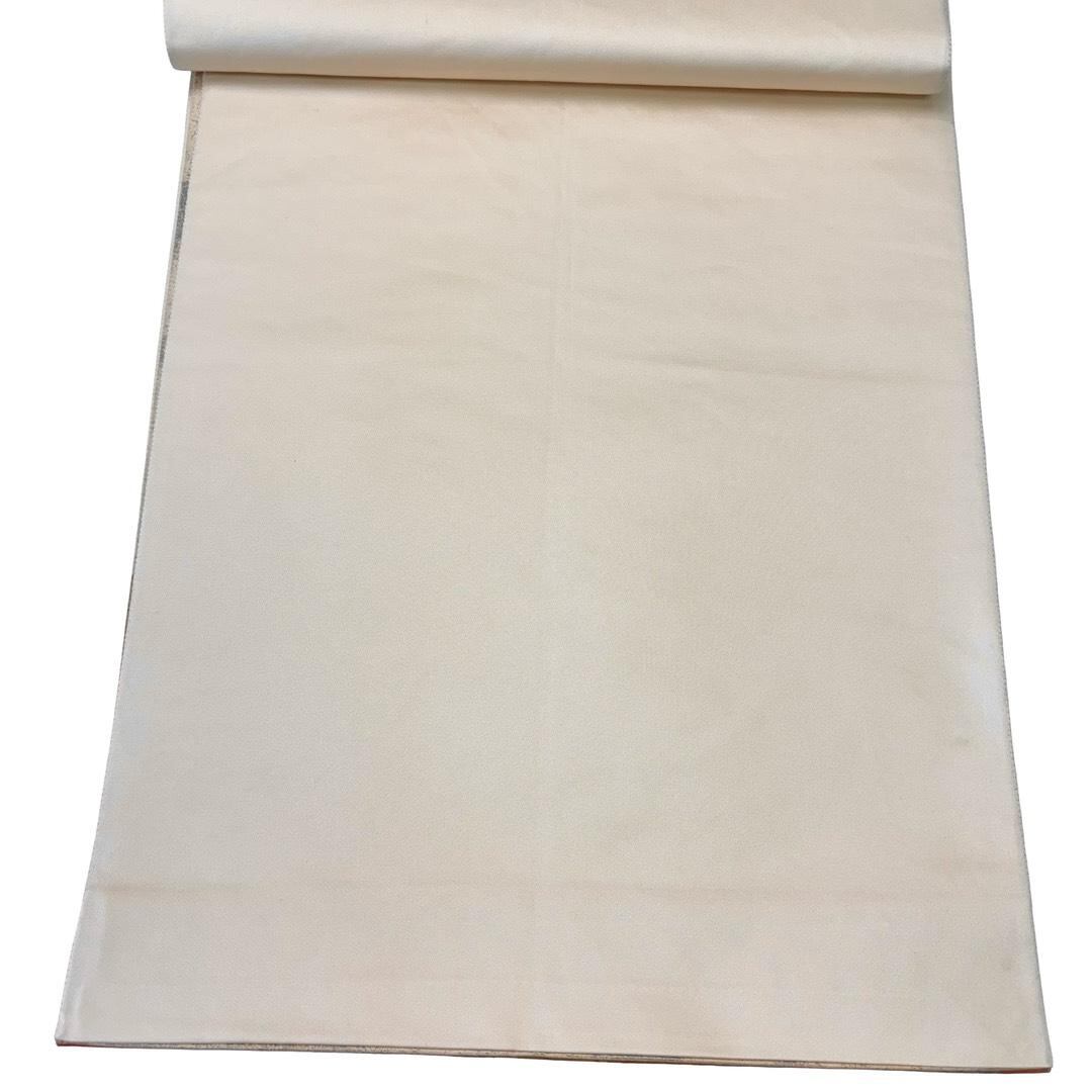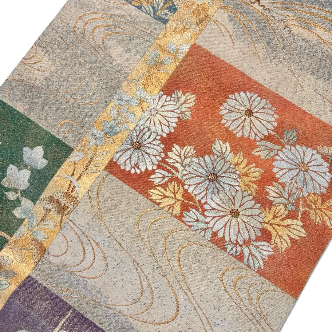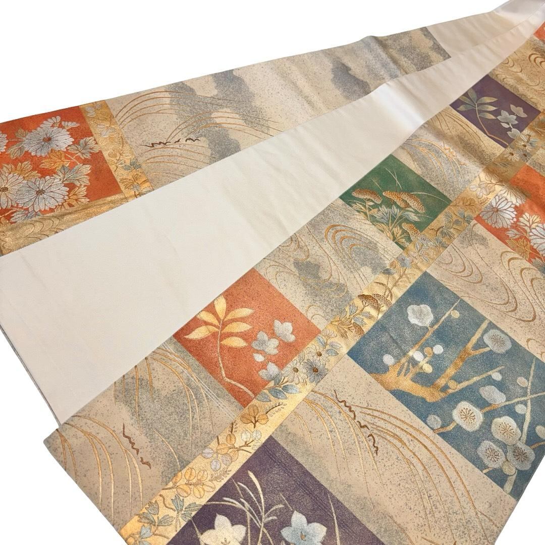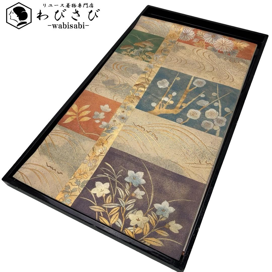袋帯 四角に花模様 梅 桔梗 流水 金銀彩 練色 O-6202 着物 きもの kimono 和服 和装 中古 リサイクル着物 【送料無料】