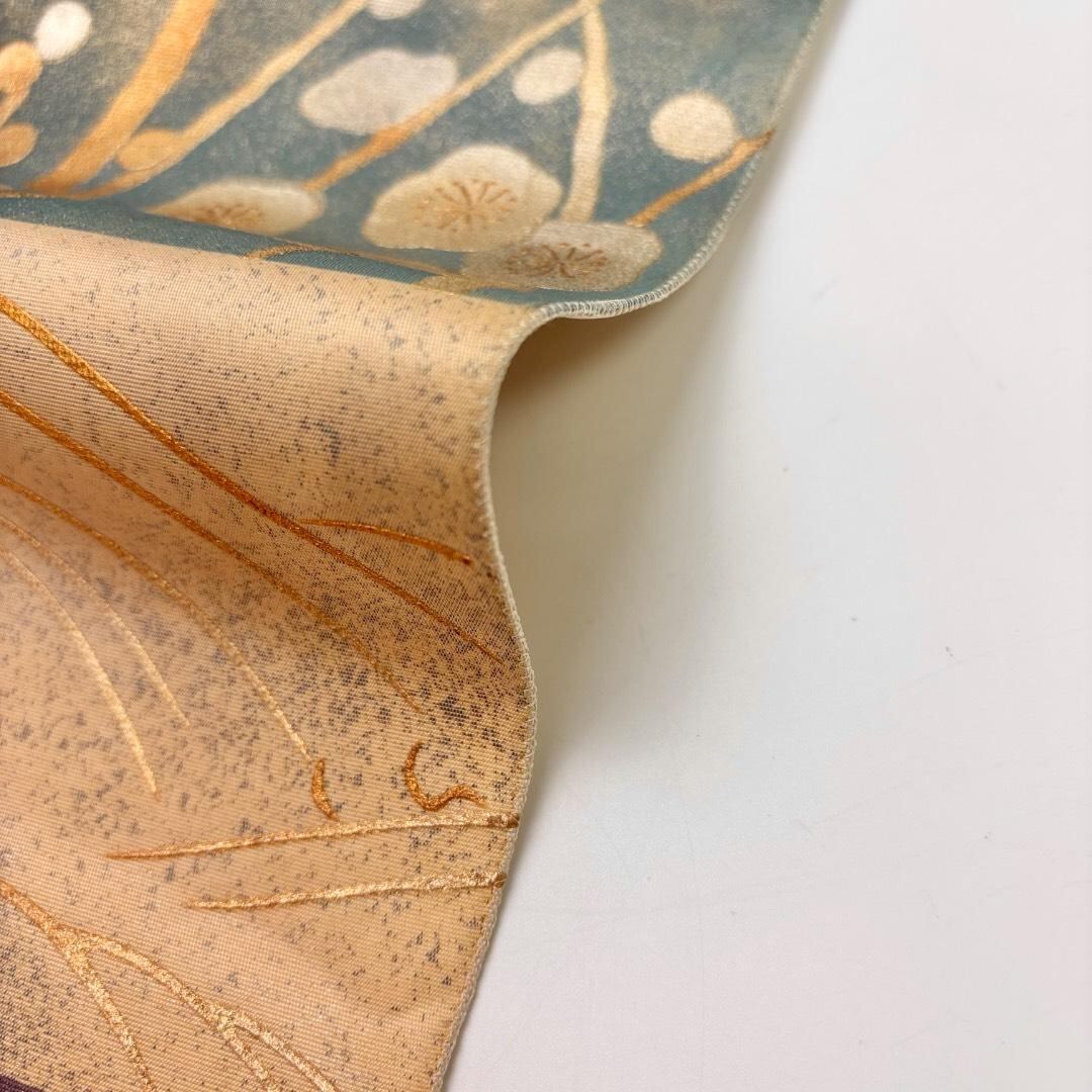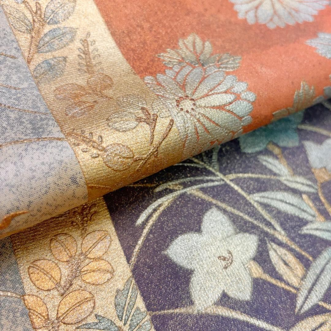 練色ベースのお色味に四角、流水に梅、桔梗などの花模様がデザインされた素敵なお品でございます。