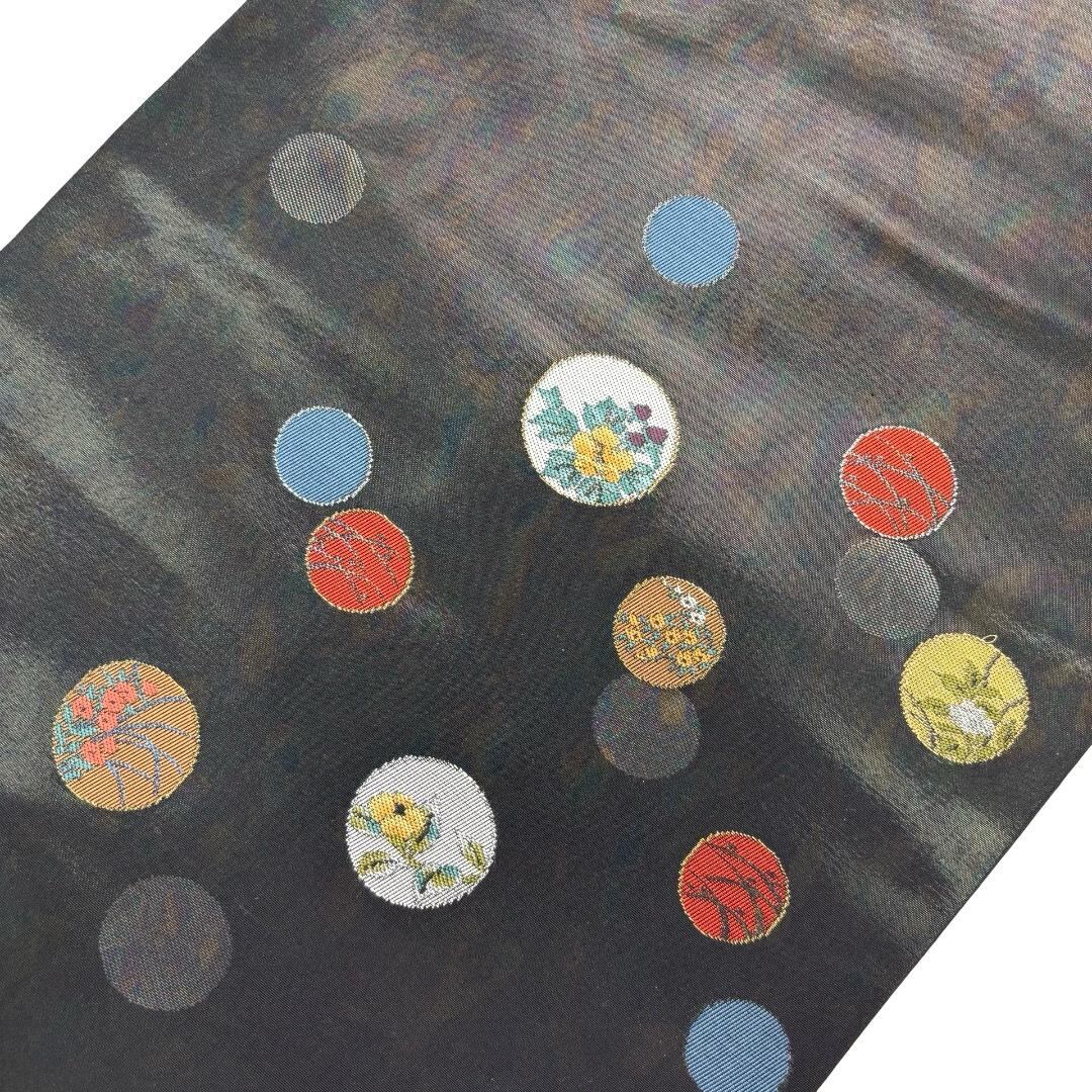 名古屋帯 水玉模様 露芝に花柄 黒鼠色 O-6203 着物 きもの kimono 和服 和装 中古 リサイクル着物 【送料無料】