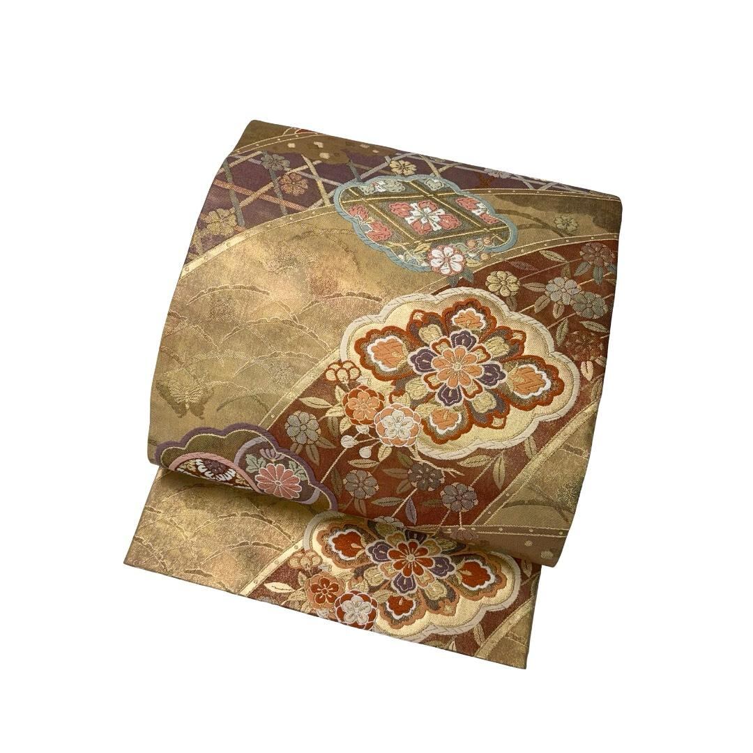 袋帯 慶長重ね 井桁瑞華文 雲取りに華模様 金糸 山吹鼠色 O-6211 着物 きもの kimono 和服 和装 中古 リサイクル着物 【送料無料】