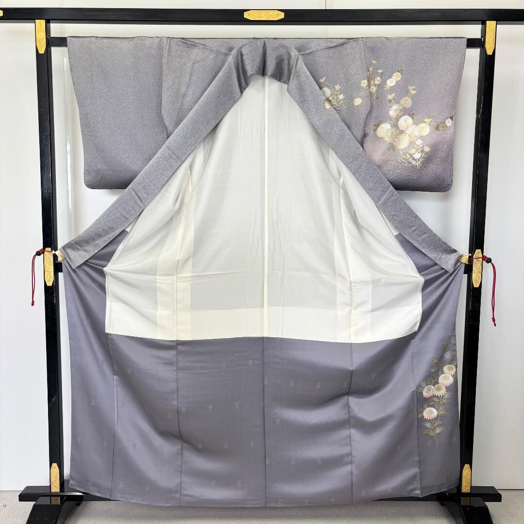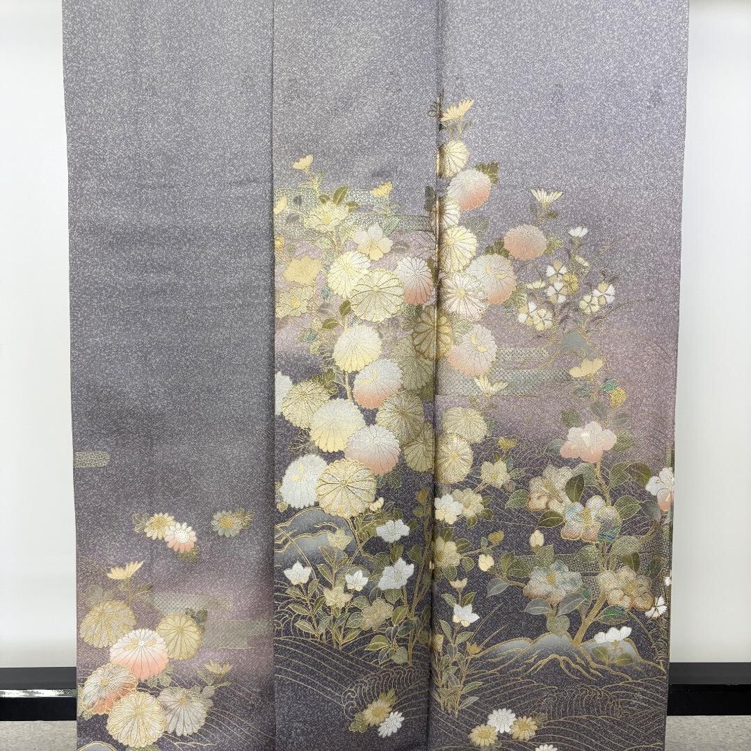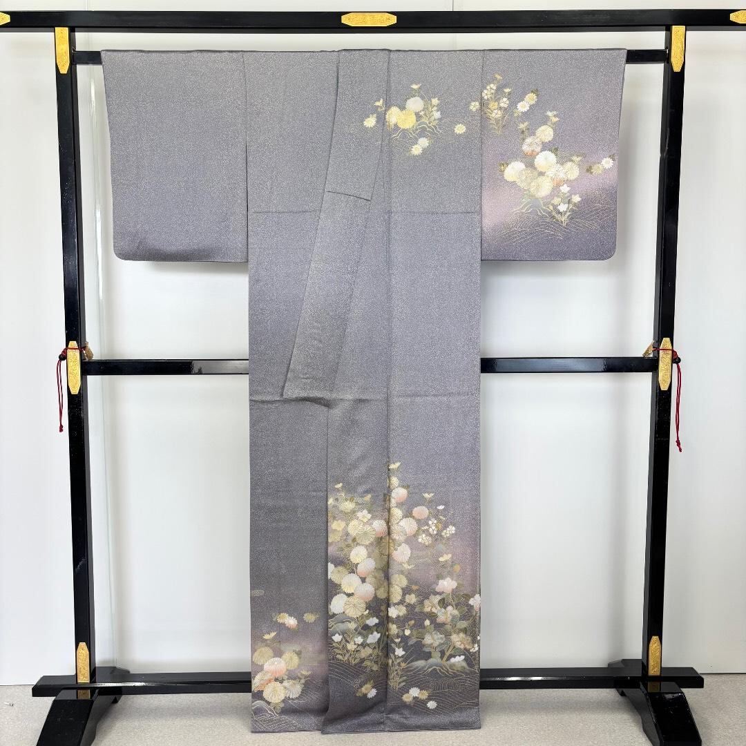 訪問着 美しい花模様 金彩 叩き染 貴族鼠色 K-5922 着物 きもの kimono 和服 和装 中古 リサイクル着物 【送料無料】