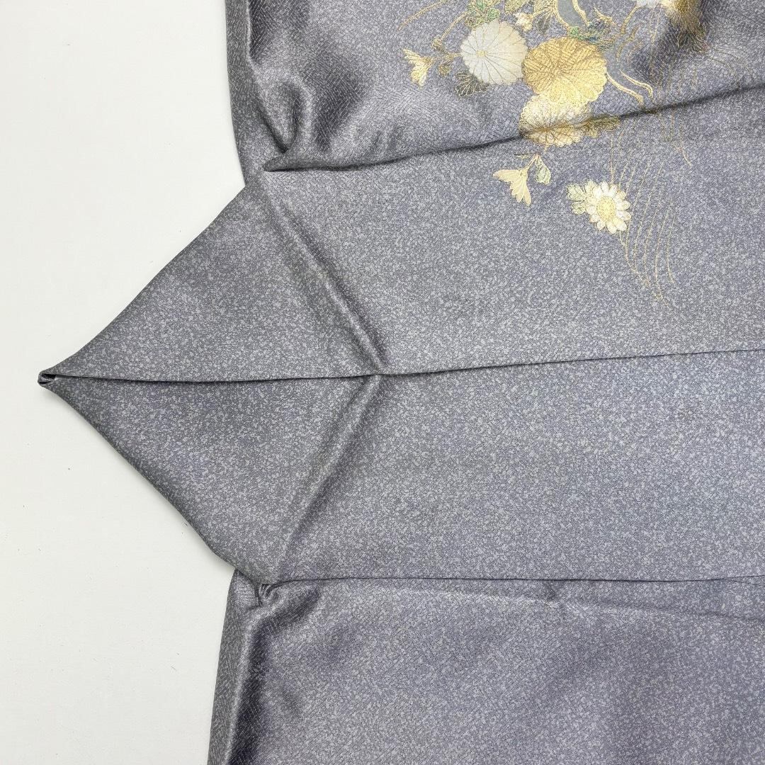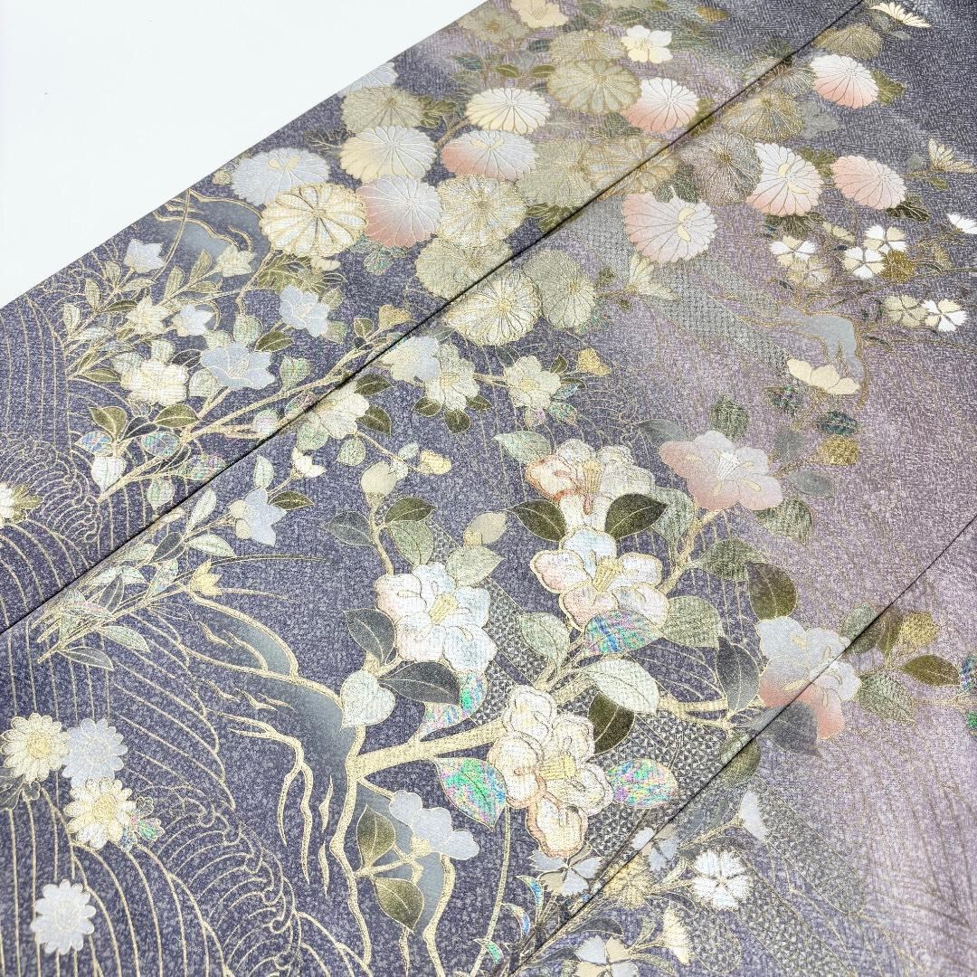 貴族鼠色の品のあるお色味に金彩の美しい花模様がデザインされた素敵な柄裄のお品でございます。
