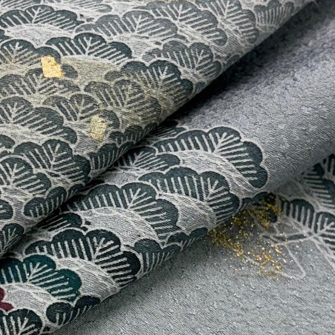 空鼠色の上品なお色味に天橋立の松模様、エ霞がデザインされた雰囲気の良い素敵なお品でございます。