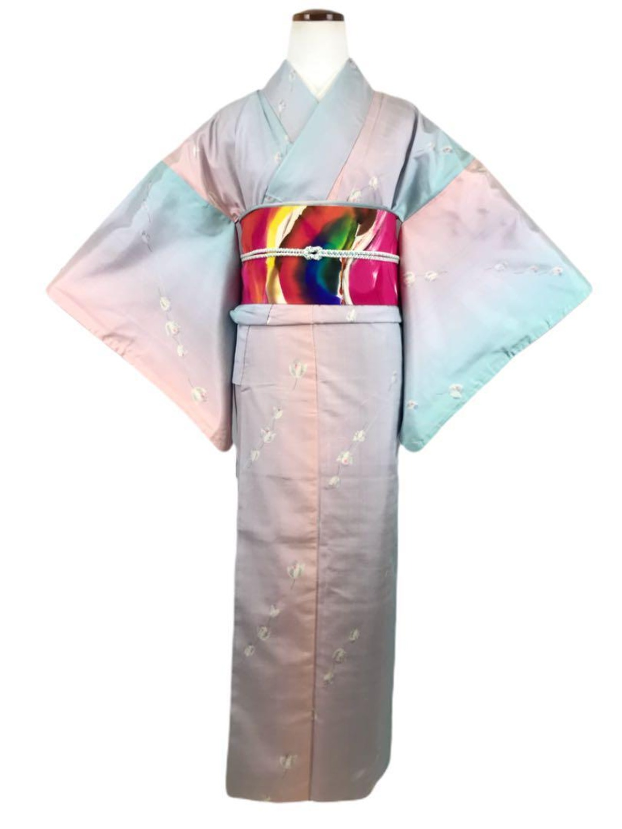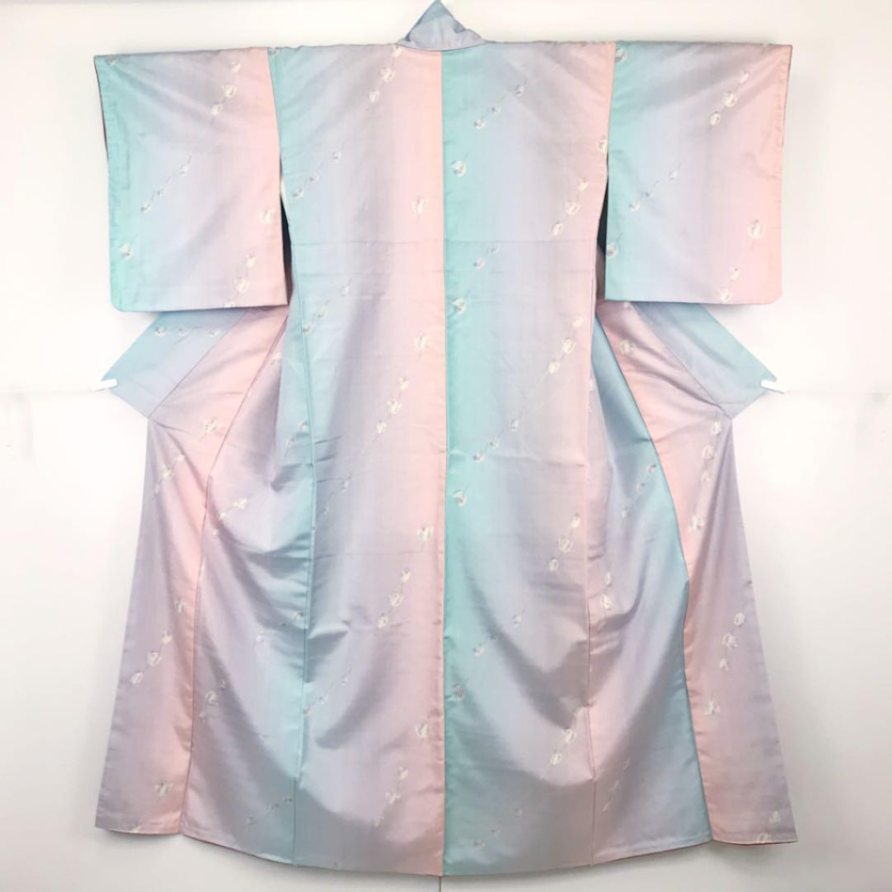 紬着物 パステル調のグラデーション 白い小花柄 しつけ糸 K-1438