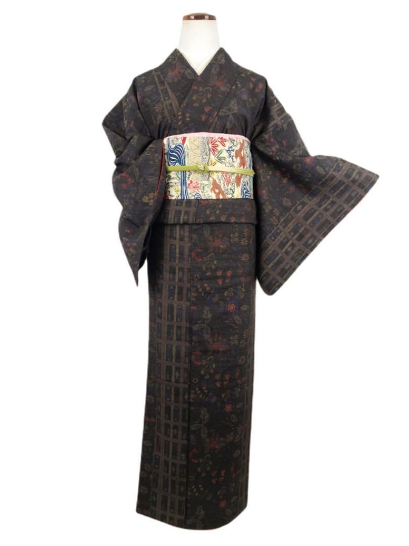 紬着物 花草柄の絣 格子模様 落ち着いたお色味 K-1494
