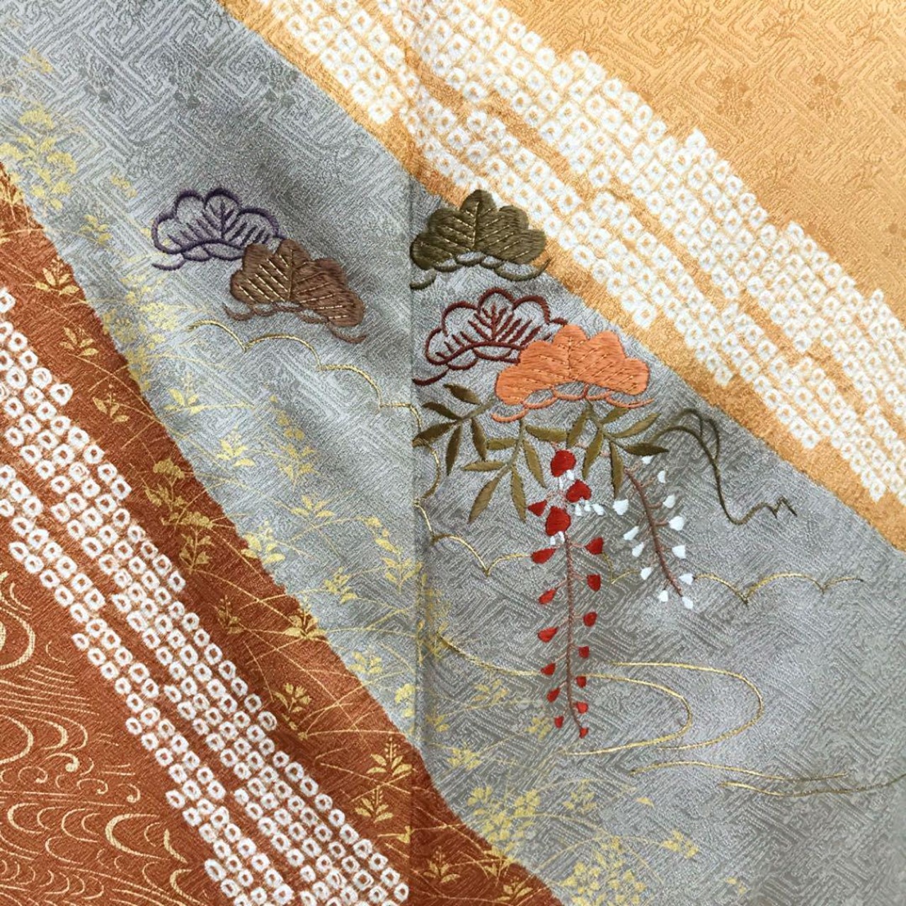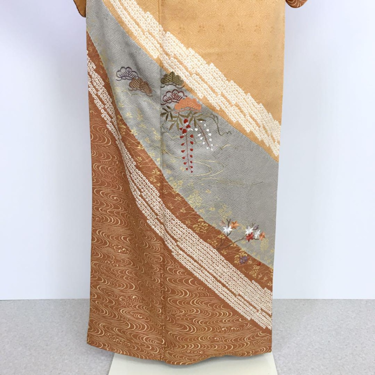 付下げ 松 紅葉 藤 刺繍 鹿の子絞り 小麦色 K-1736