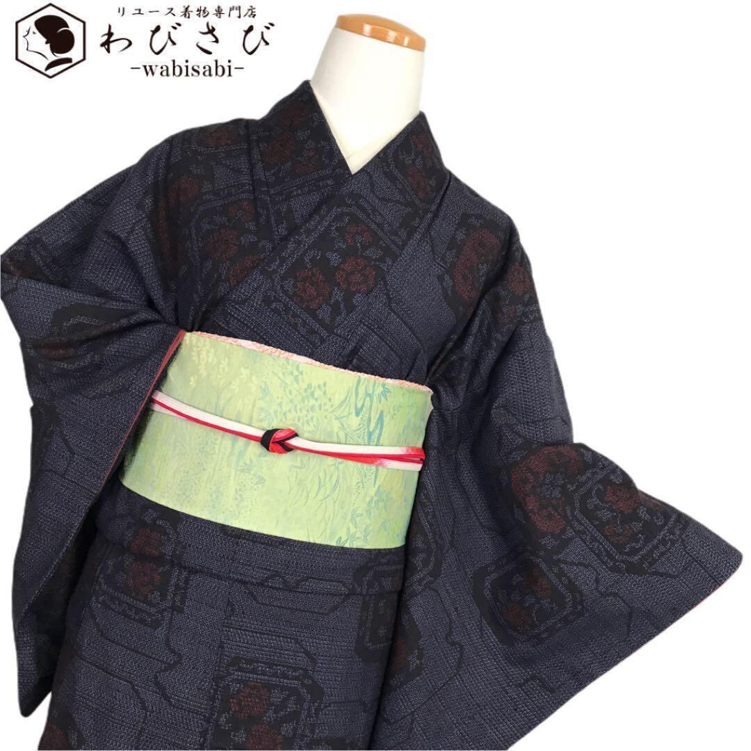 真綿紬 枠の中赤い花 亀甲柄 藍色 K-1771