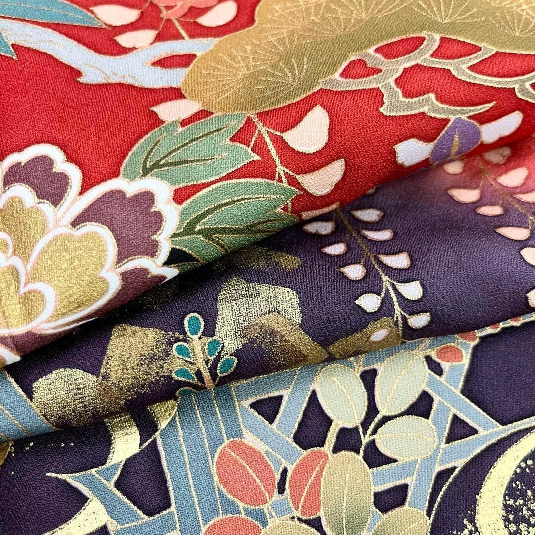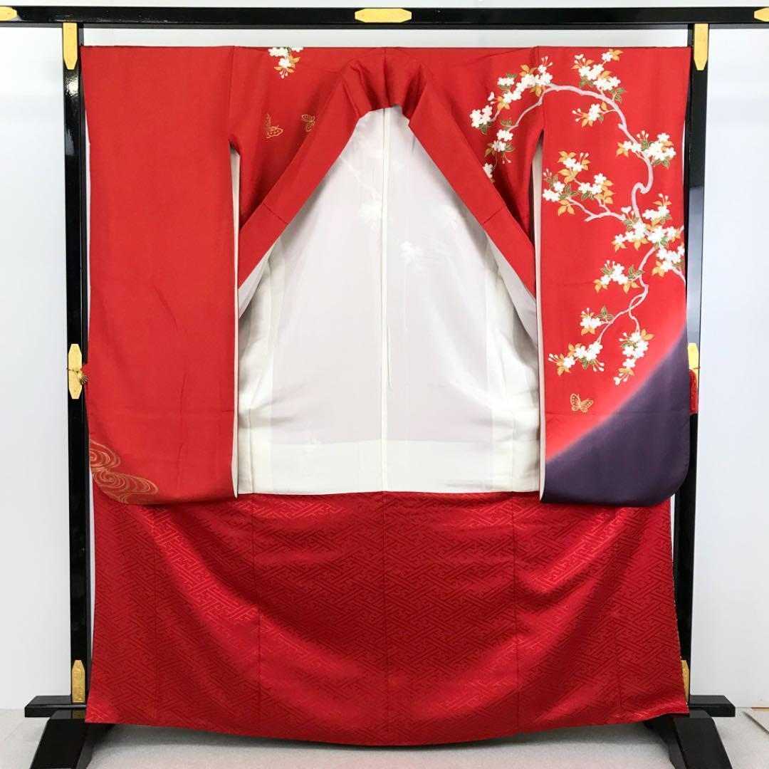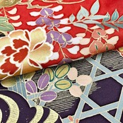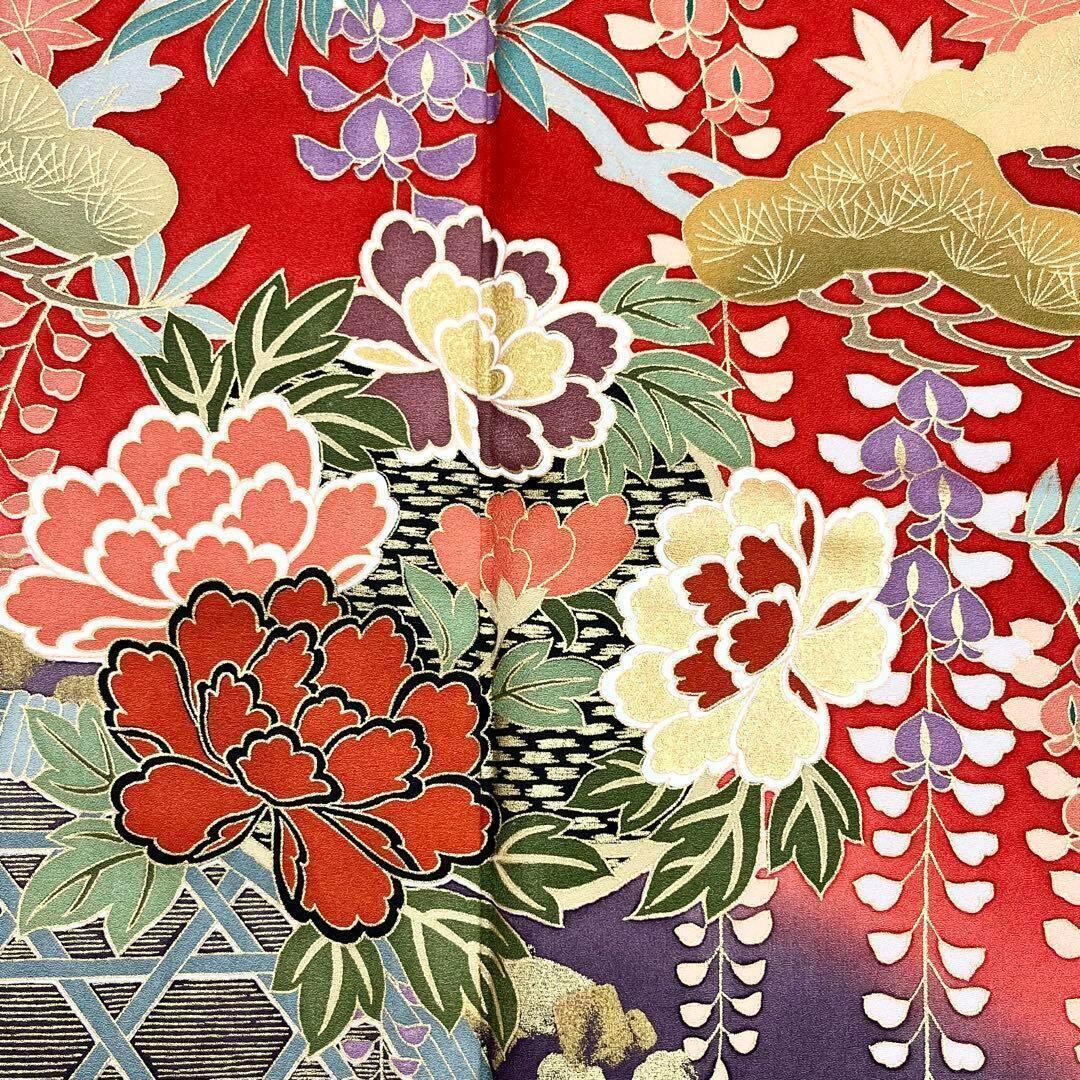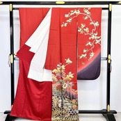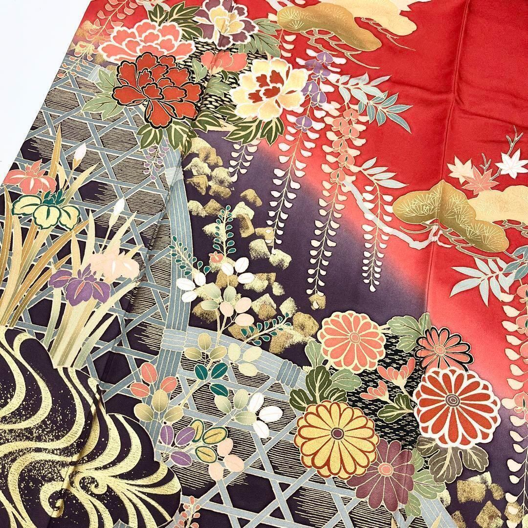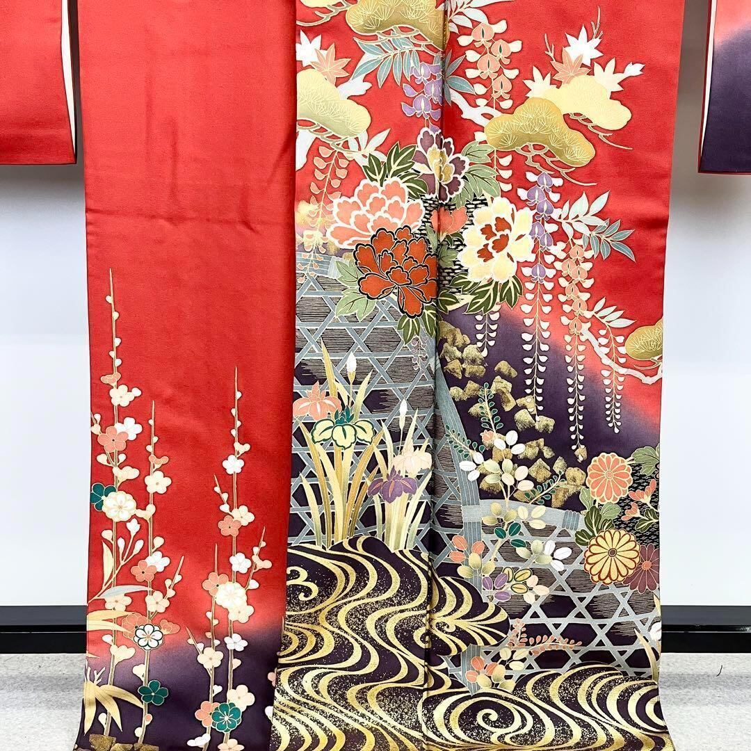 鮮やかな赤色に金彩などで煌びやかにデザインされた四季の花々が素敵なお品でございます。