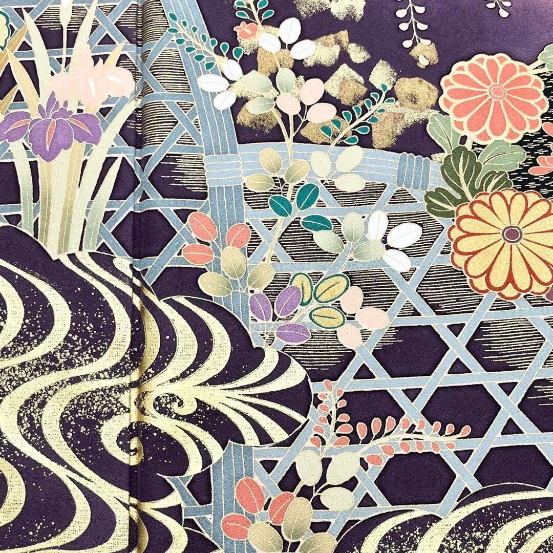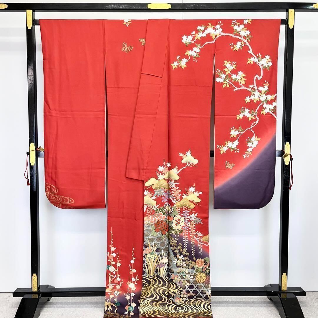 振袖 美しい四季の花々 流水 竹垣 金彩 赤紅色 トールサイズ K-2036 着物 きもの kimono 和服 和装 中古 リサイクル着物 【送料無料】