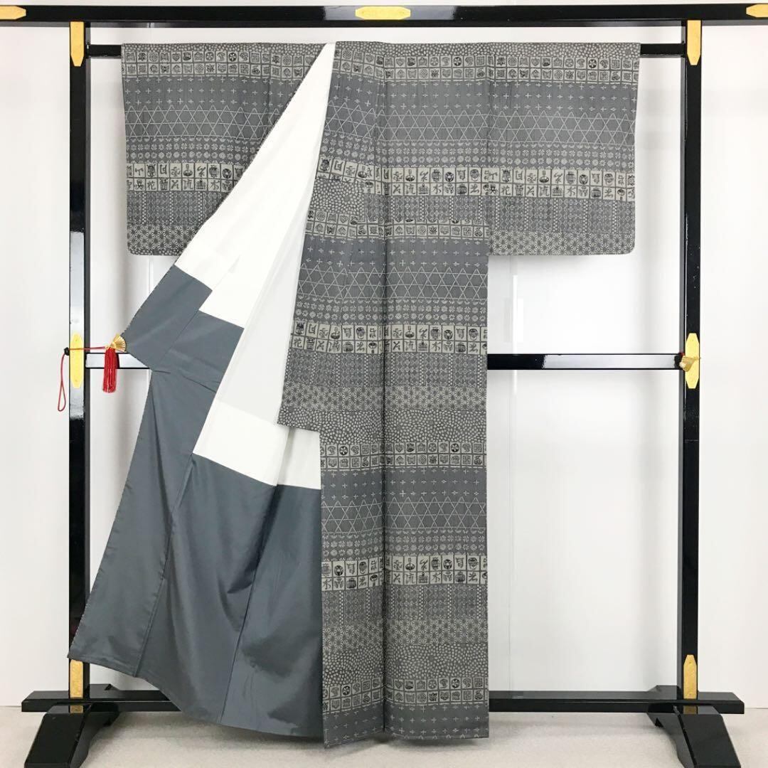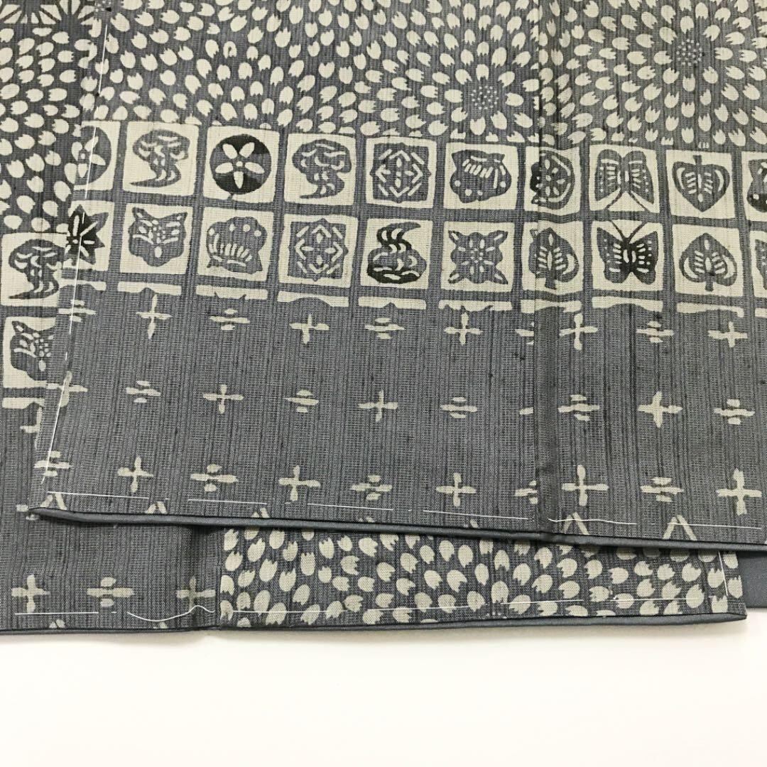薄墨色の上質な紬地に東京染紅型染で多様な柄裄がデザインされた風合いの良い素敵な素敵なお品でございます。