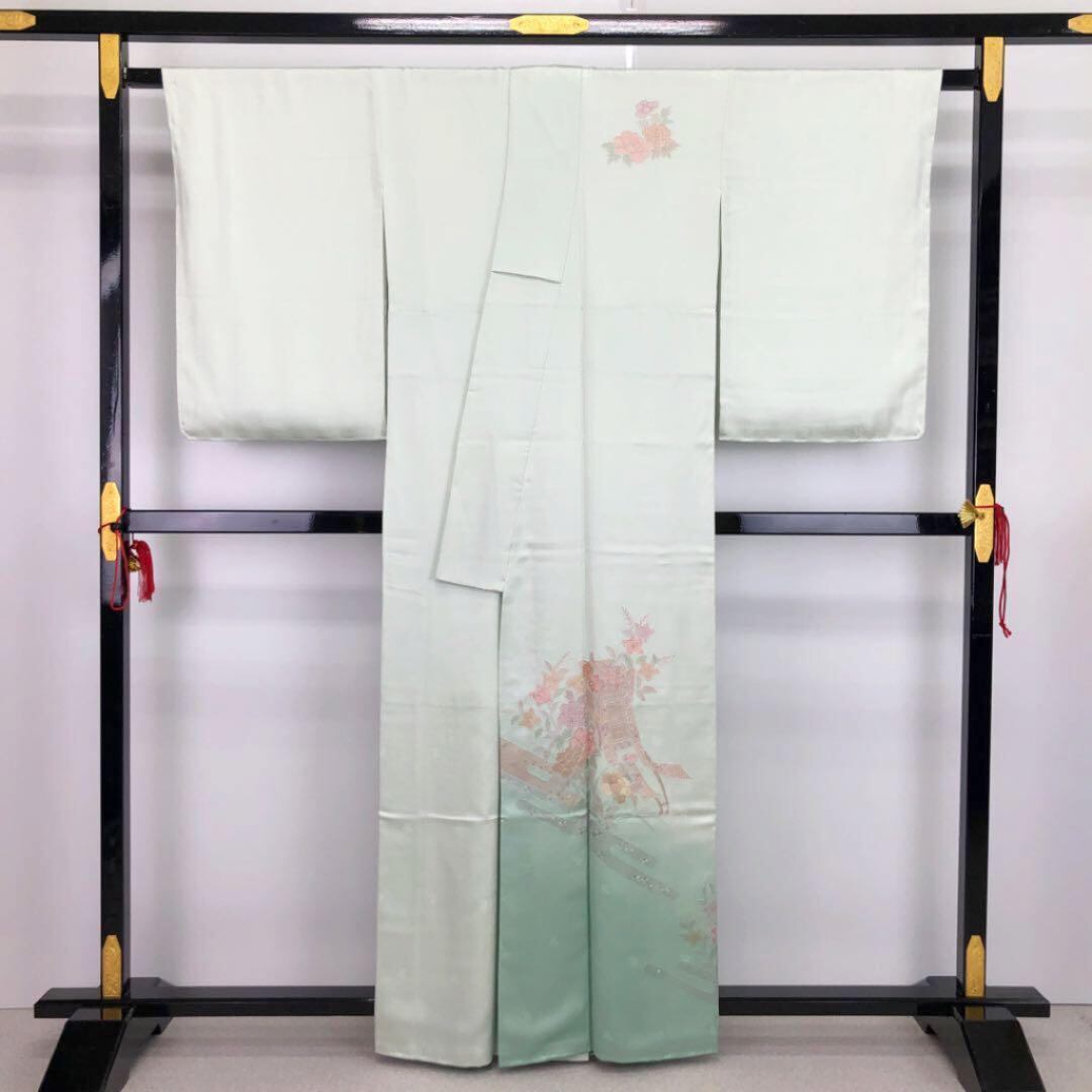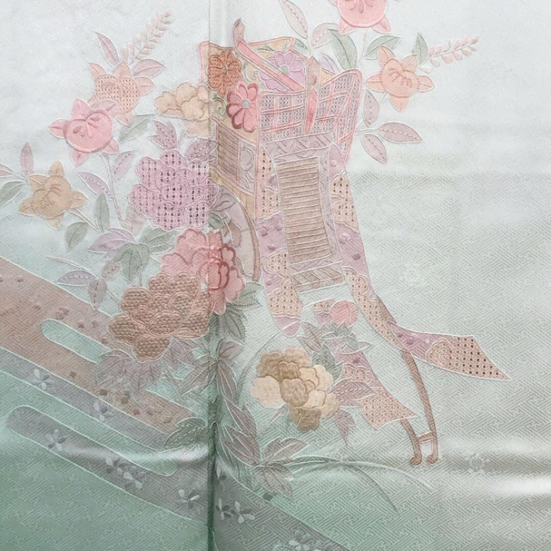付下げ 汕頭刺繍 蘇州刺繍 御所車 牡丹 桔梗 白緑色 K-2298 着物 きもの kimono 和服 和装 中古 リサイクル着物 【送料無料】