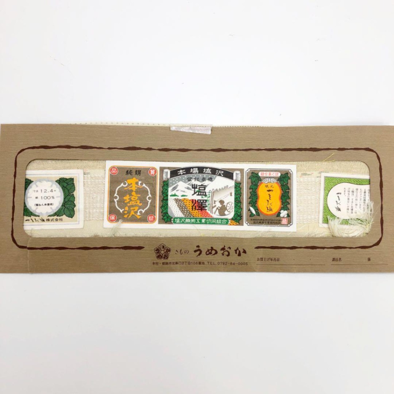 生成の地色に横柄の織模様がデザインされた証紙付きの素敵なお品でございます。