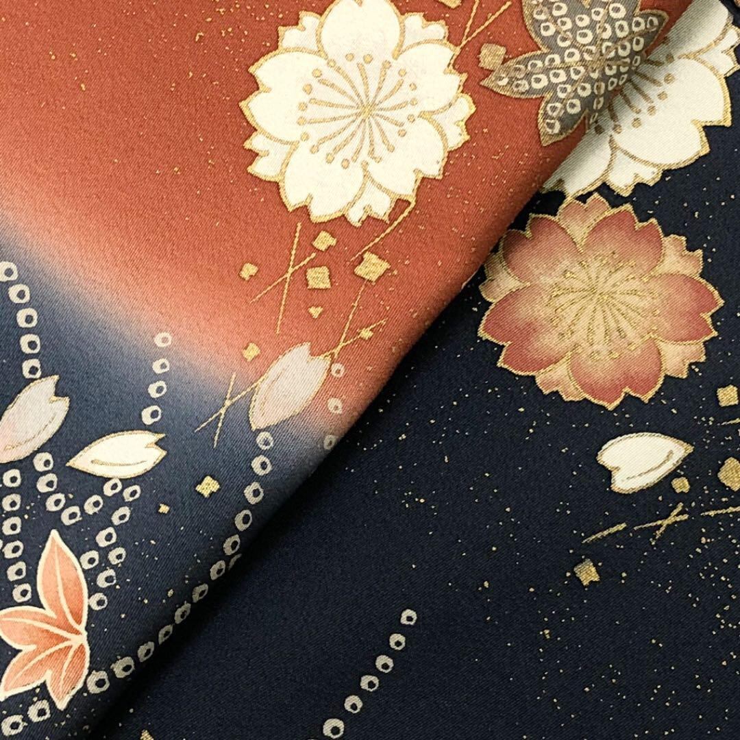 水玉模様のカラー胴裏で仕立てられており、四季の花々にグラデーション、金彩で素敵な柄裄のお品でございます。