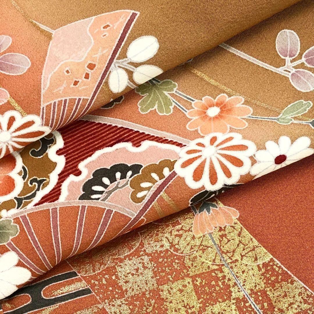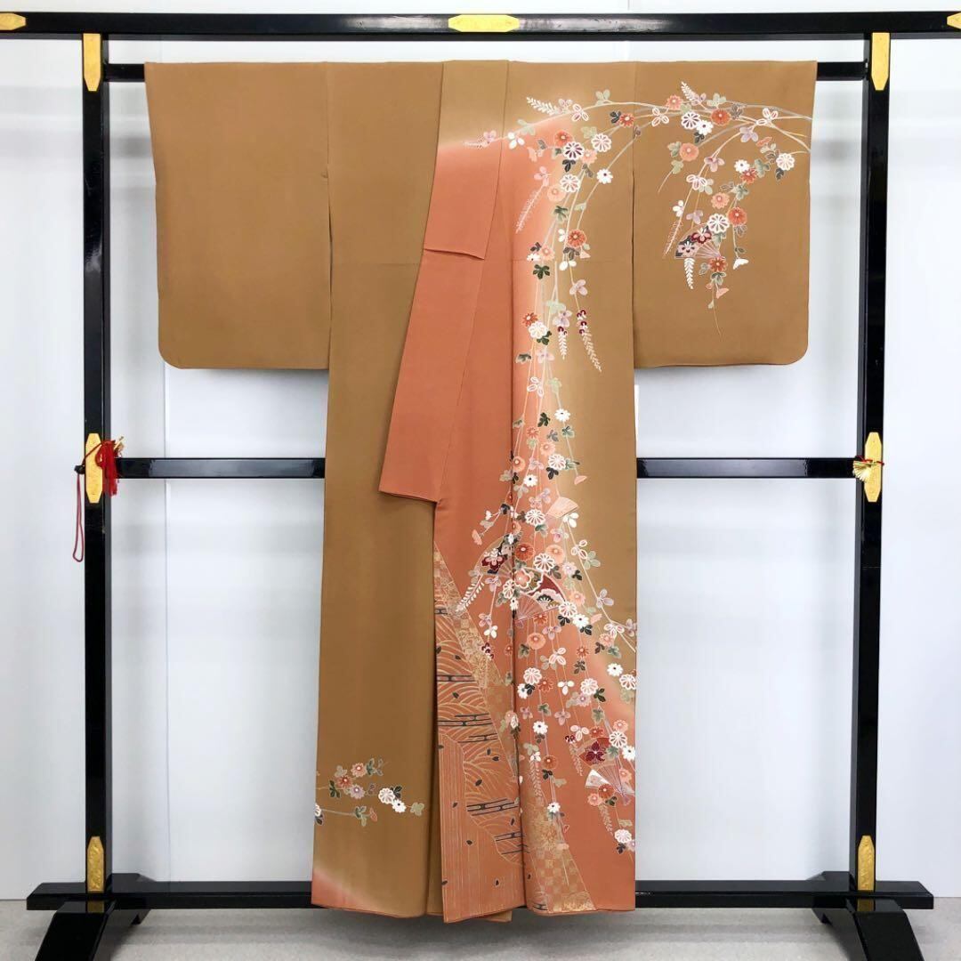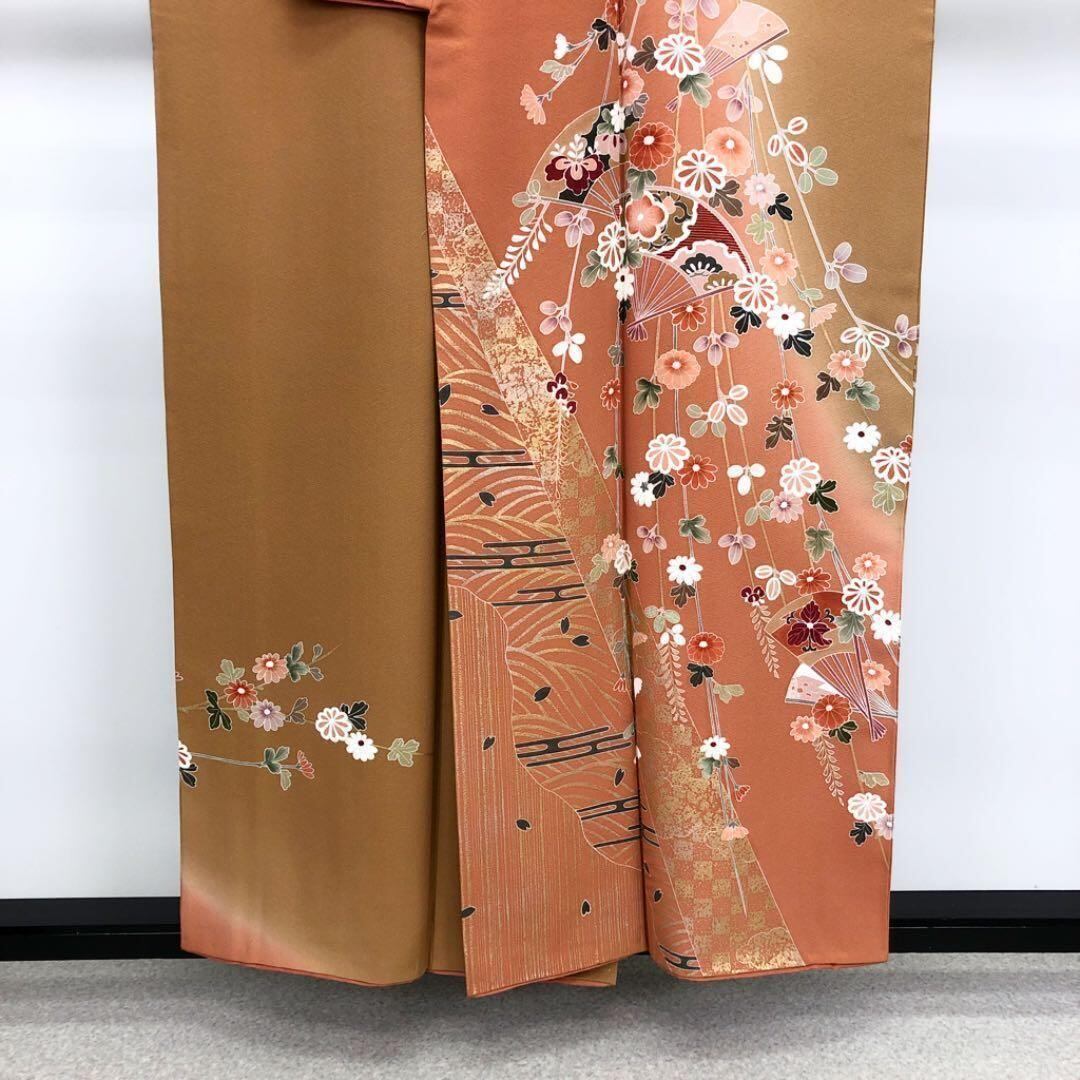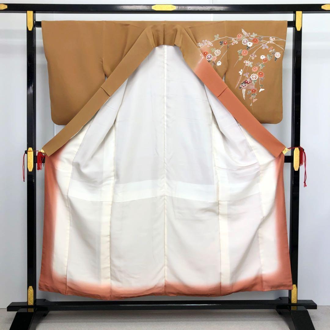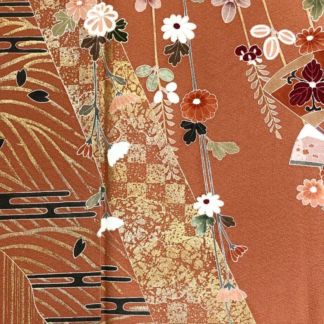訪問着 美しい四季の花々 金彩 橡色と中紅色 K-2474 着物 きもの kimono 和服 和装 中古 リサイクル着物 【送料無料】