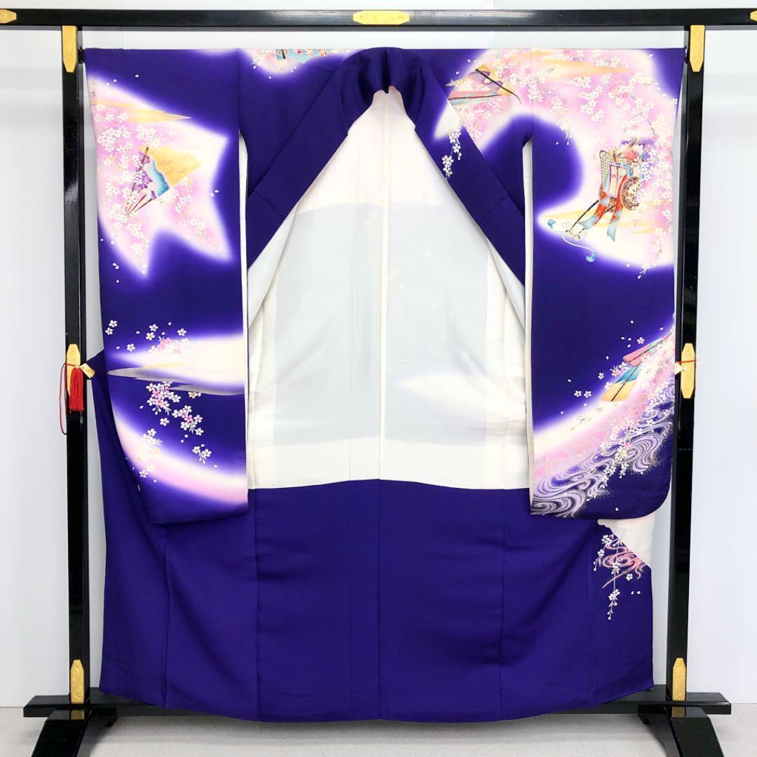 振袖 豪華な桜の花柄 御所車 牡丹 金銀彩 紫紺色 ガード加工 K-2501