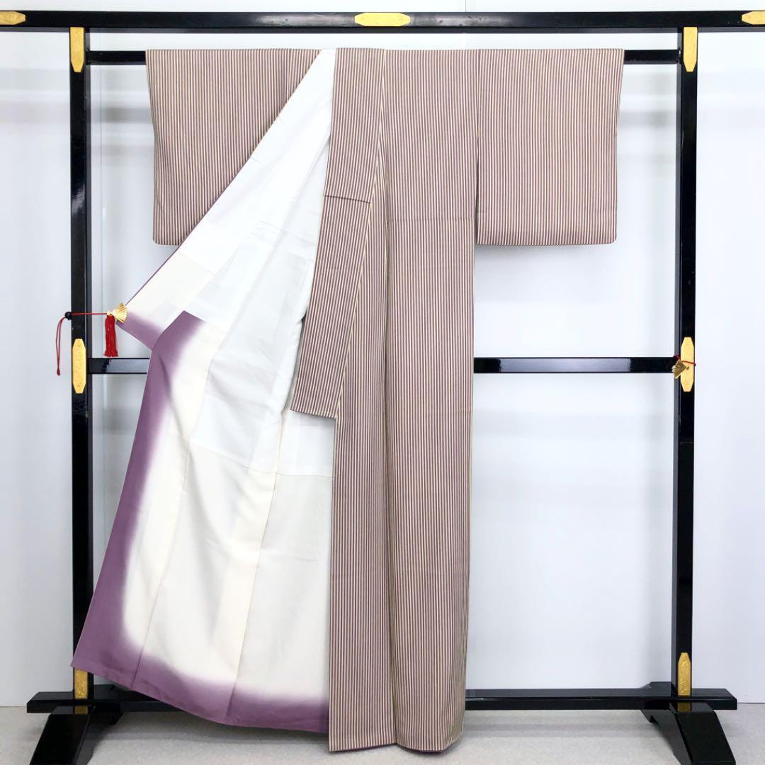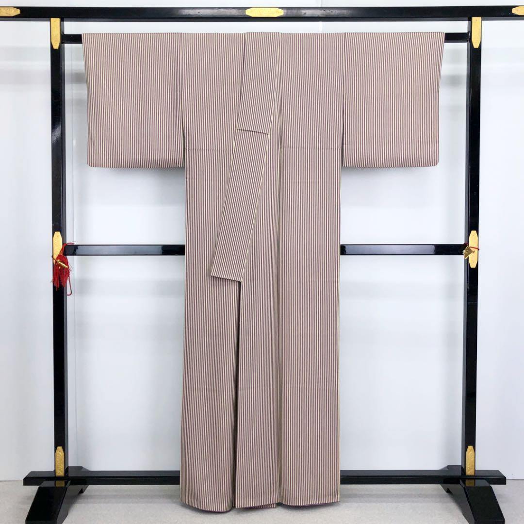 落ち着いたお色味の縮緬に縦柄のストライプがデザインされた素敵なお品でございます。