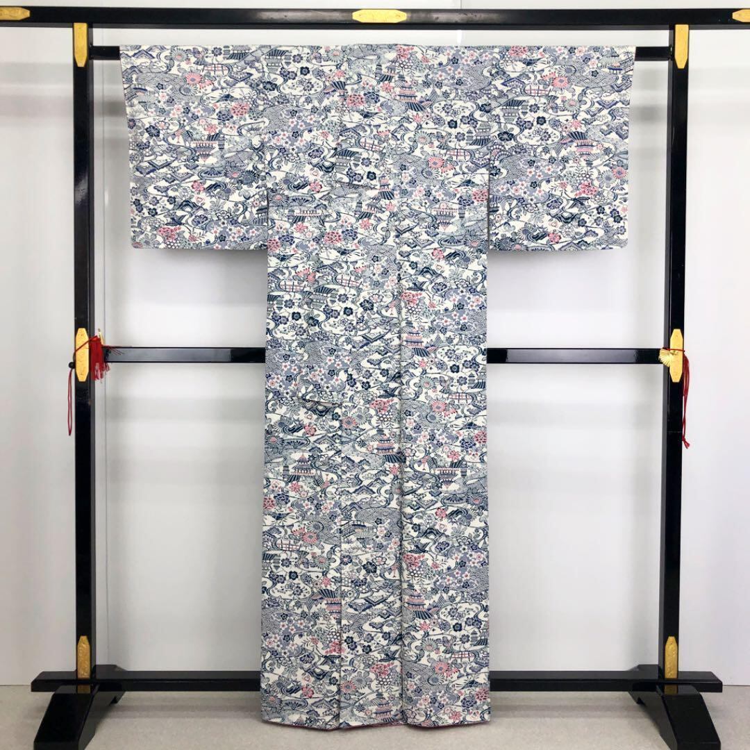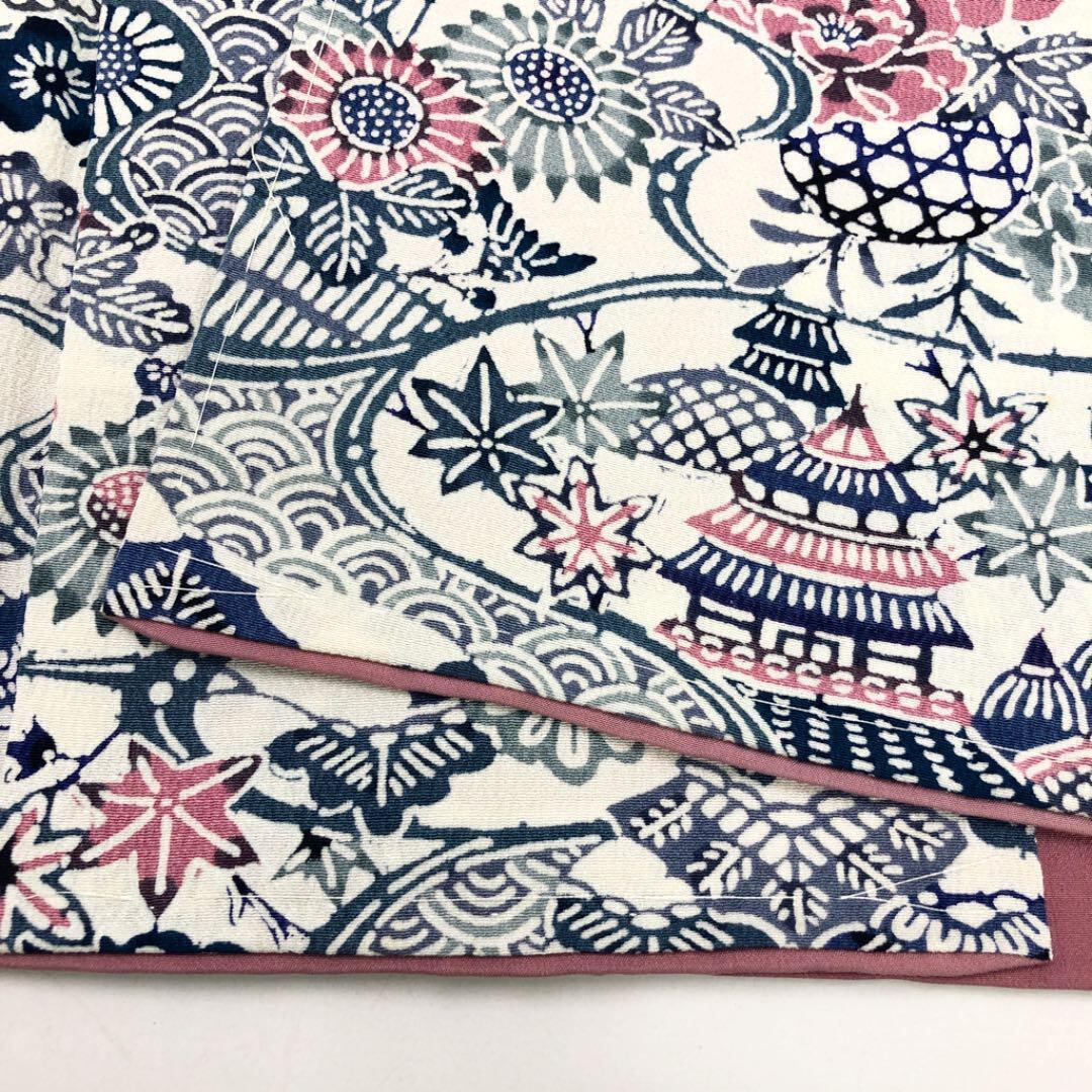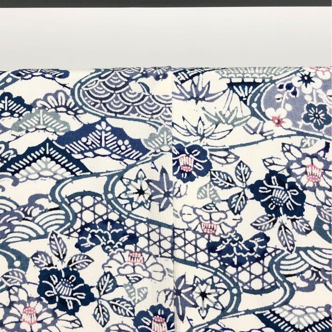 小紋 型染 縮緬 四季の花柄 牡丹 菊 紅葉 白百合色 しつけ糸 K-2607 着物 きもの kimono 和服 和装 中古 リサイクル着物 【送料無料】