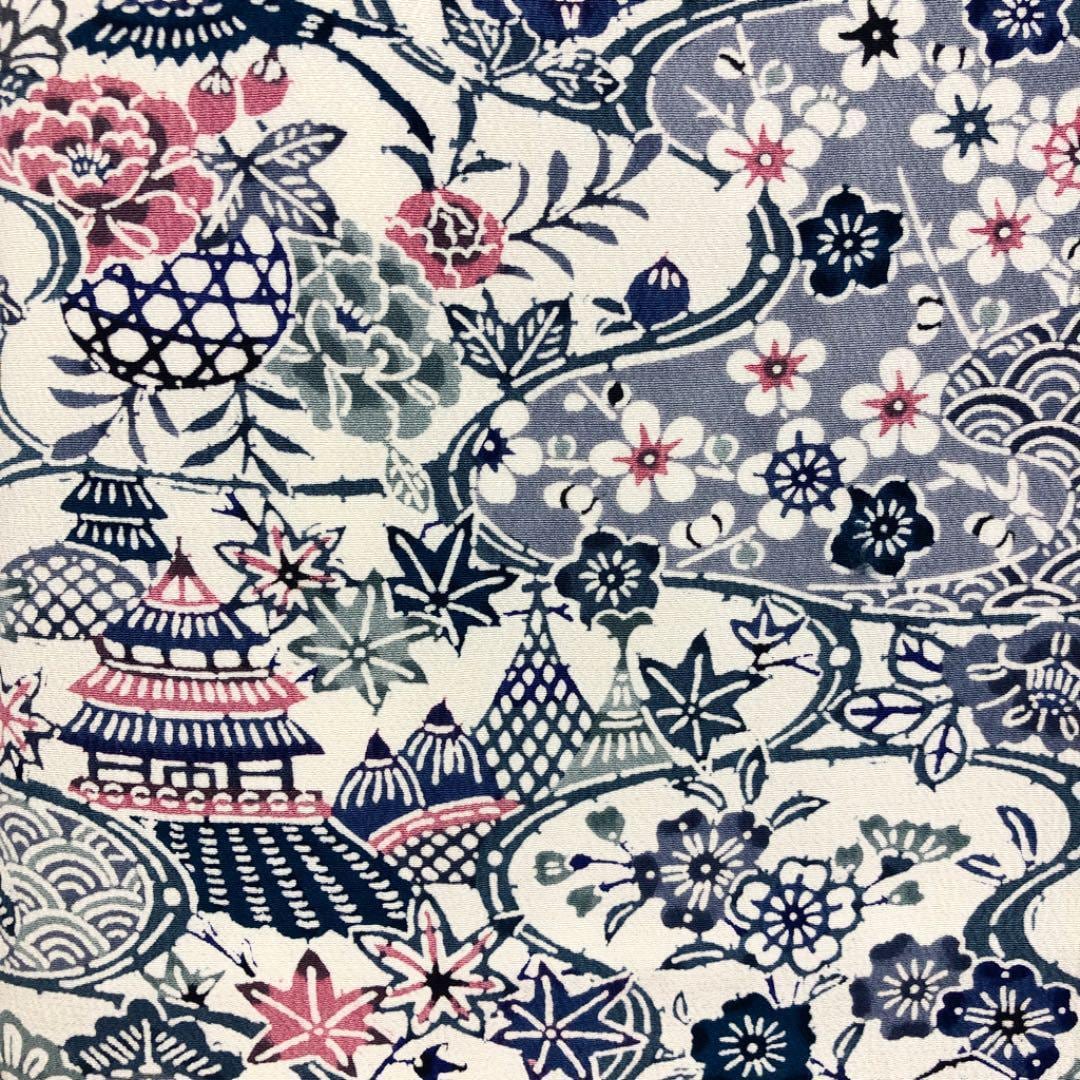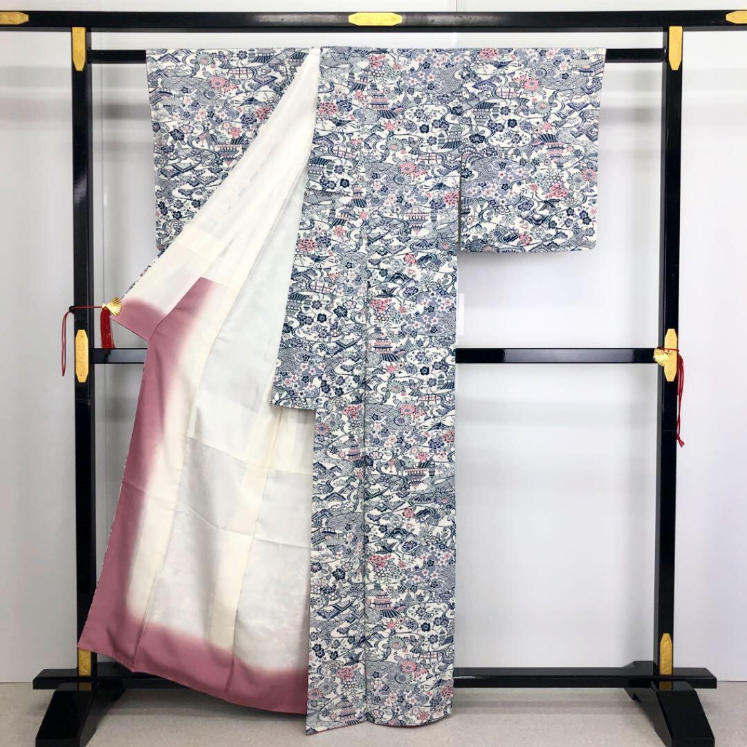 質感の良い白百合色の縮緬に四季の花柄や鳥などがデザインされた素敵なお品でございます。