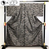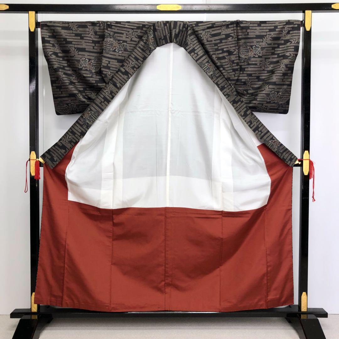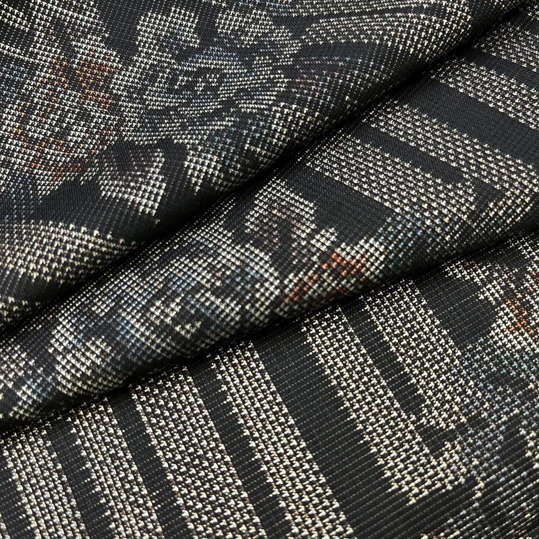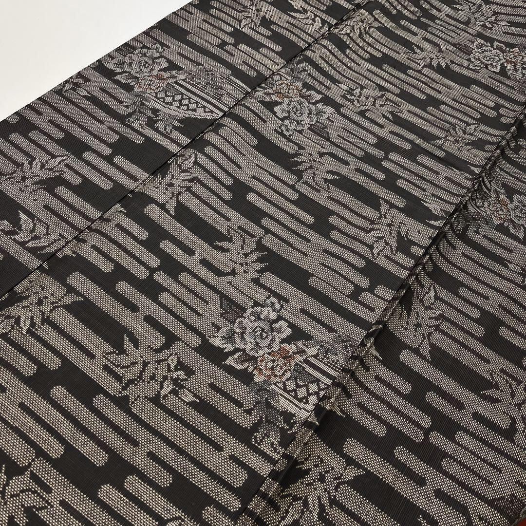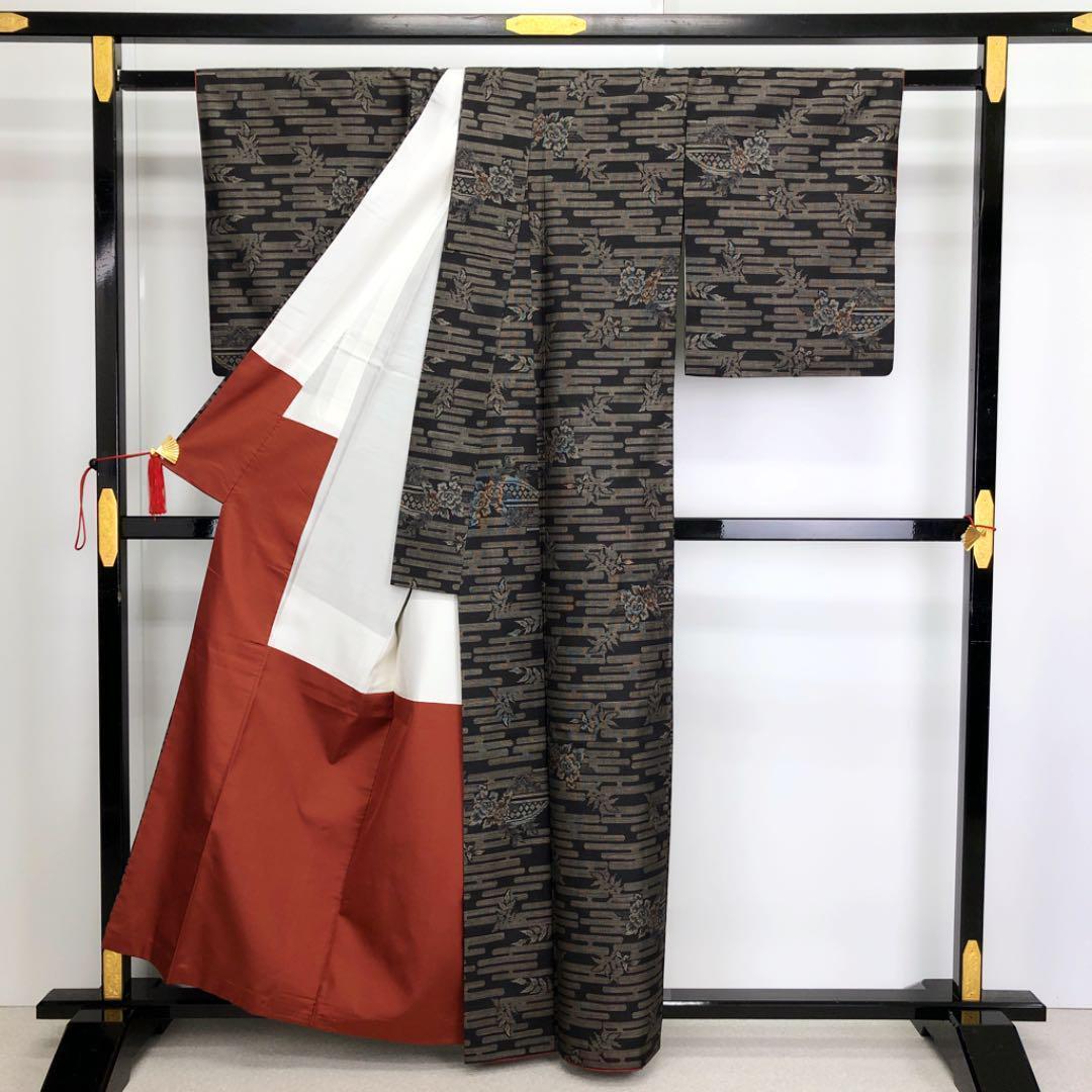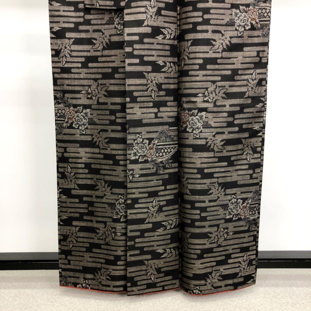 黒地、茶泥染の美しい色合い、エ霞に美しい2色の牡丹の花柄がデザインされた素敵なお品でございます。