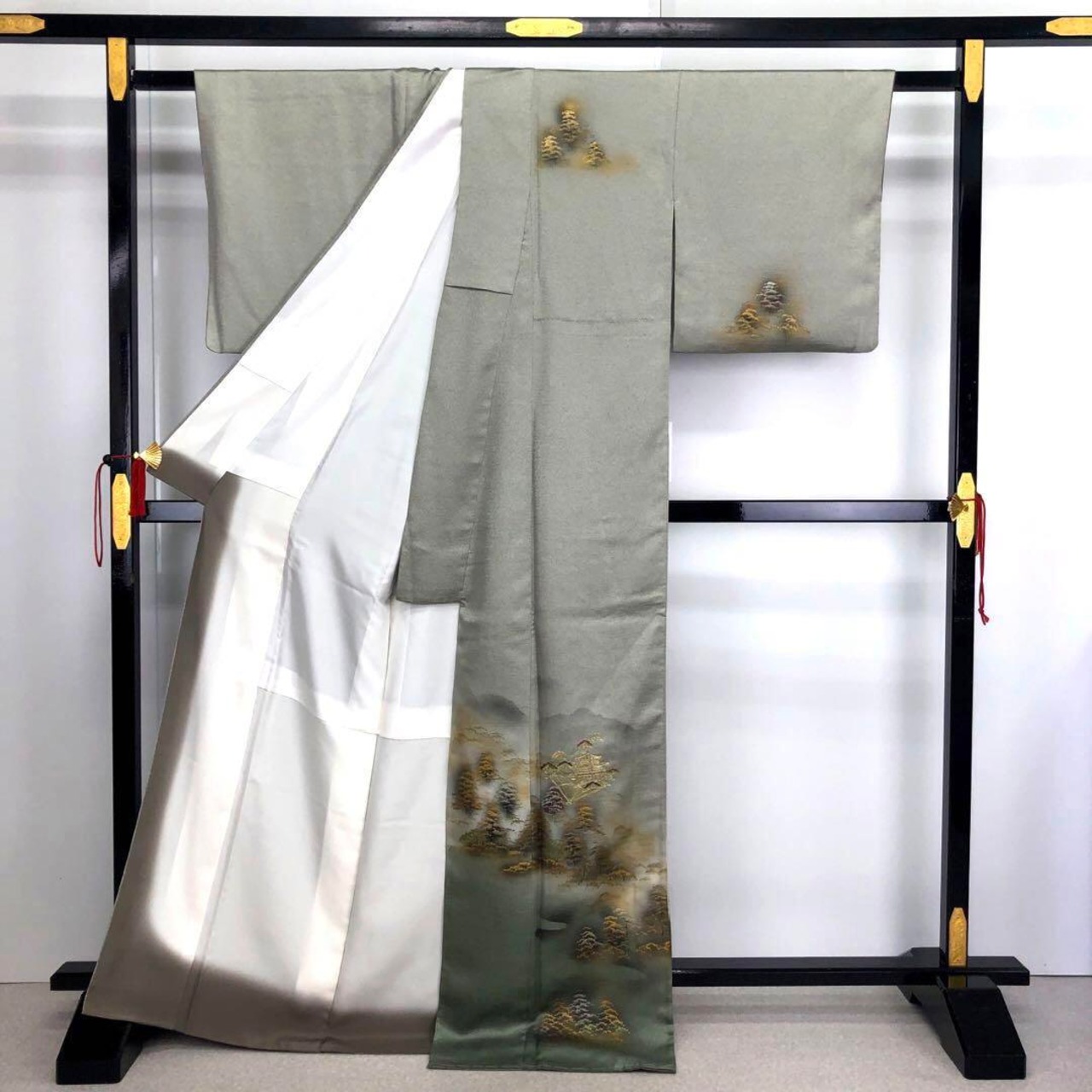 付下げ 金駒刺繍 寺院 扇子に松 利休鼠色 金銀彩 トールサイズ K-2783