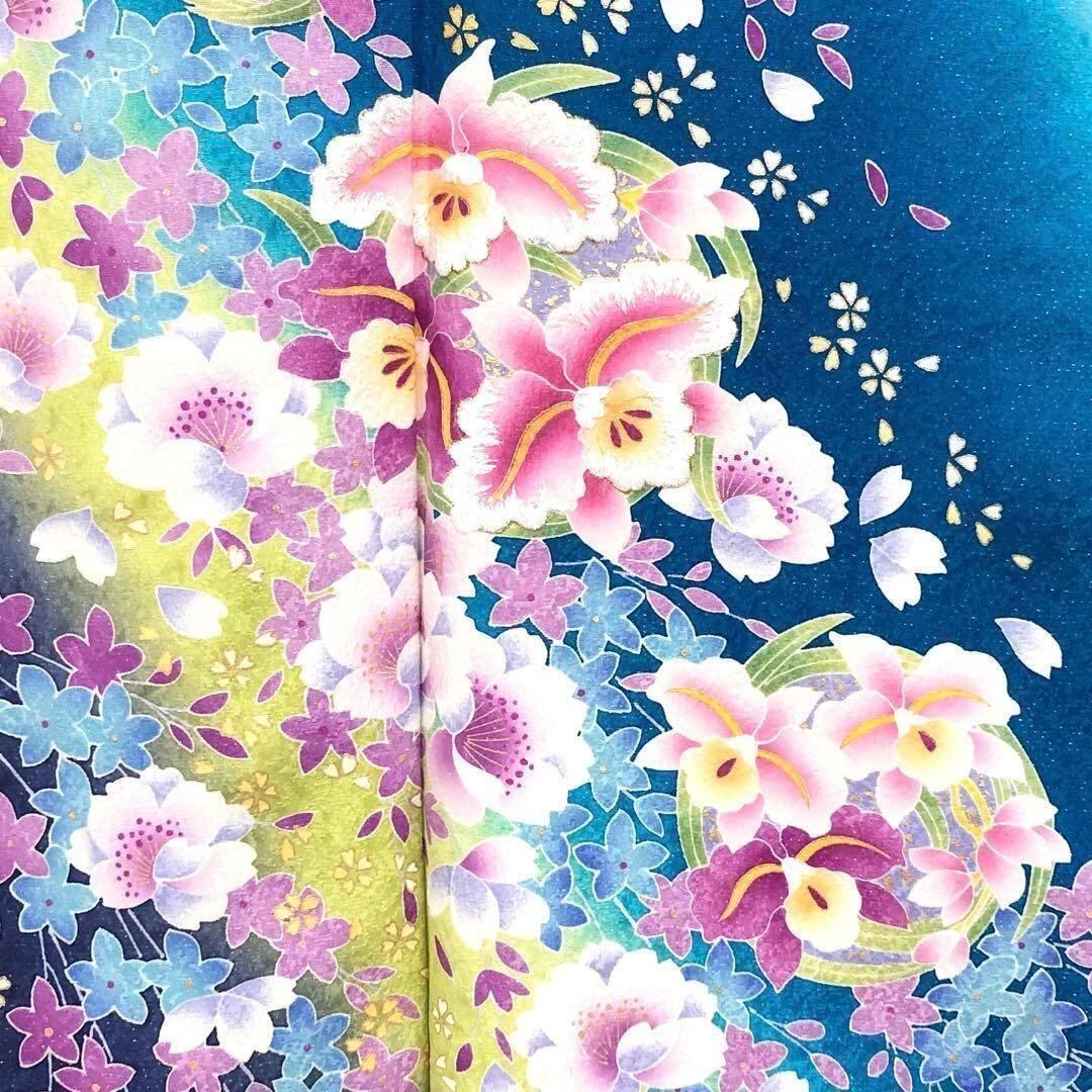 振袖 長襦袢セット 美しい花々 刺繍 銀通し 孔雀青色 ガード加工 K-2801 着物 きもの kimono 和服 和装 中古 リサイクル着物 【送料無料】