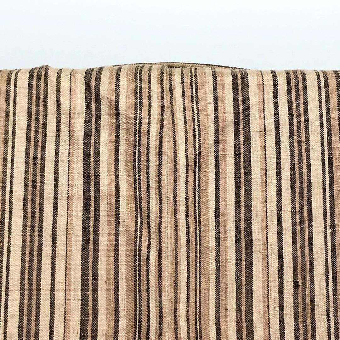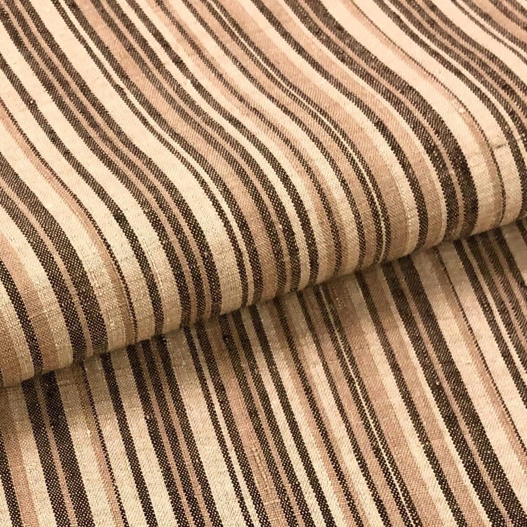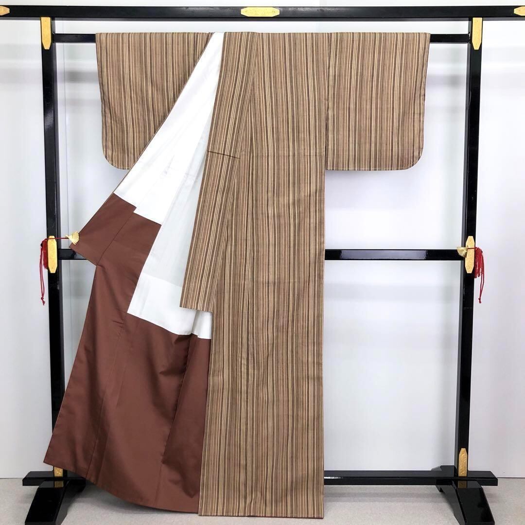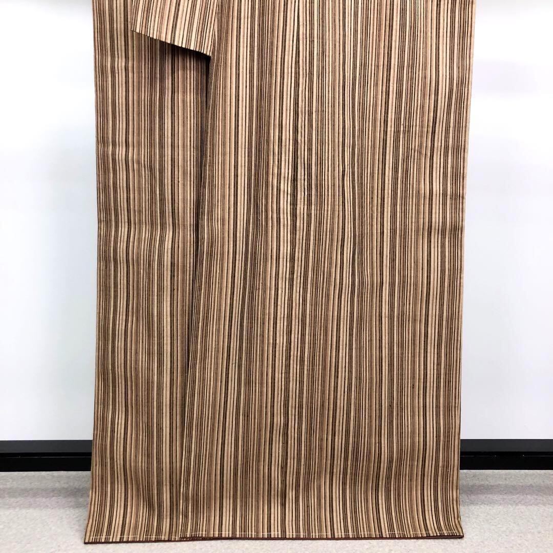 重要無形文化財『結』の最高級の結城紬、胡桃色ベースの細太様々な縦縞模様がデザインされた素敵なお品でございます。