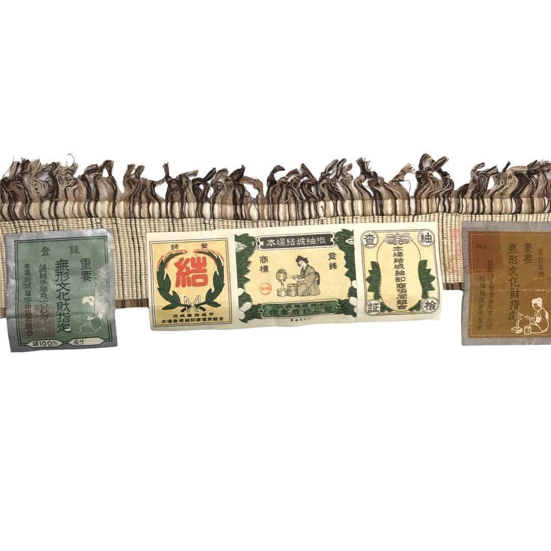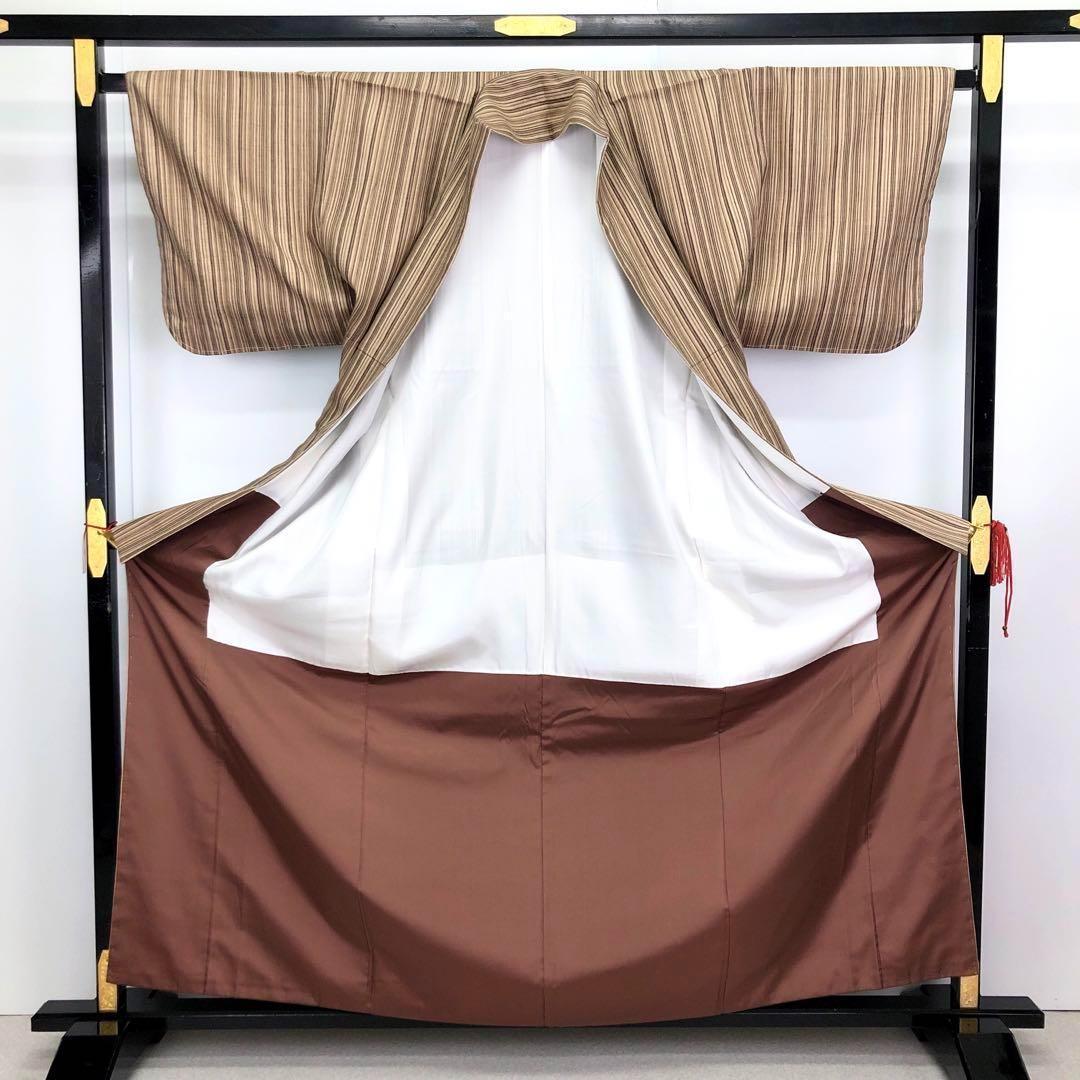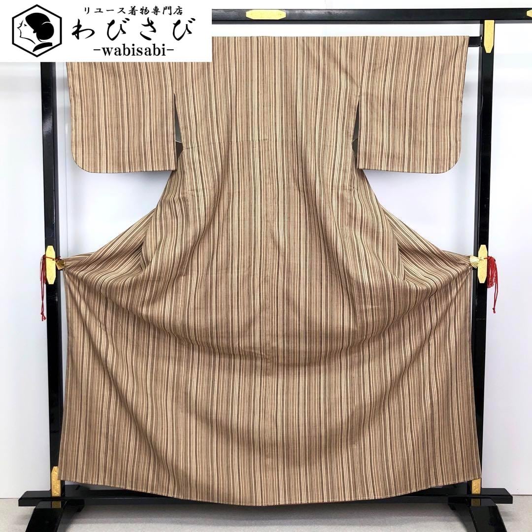 本場結城紬 結 重要無形文化財 縦縞模様 証紙付 胡桃色 しつけ糸 K-2883 着物 きもの kimono 和服 和装 中古 リサイクル着物 【送料無料】