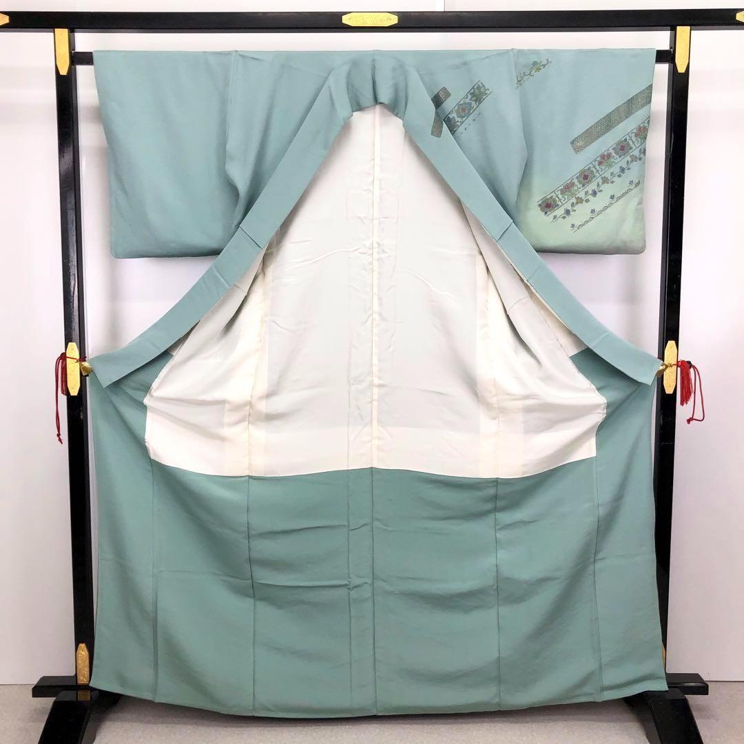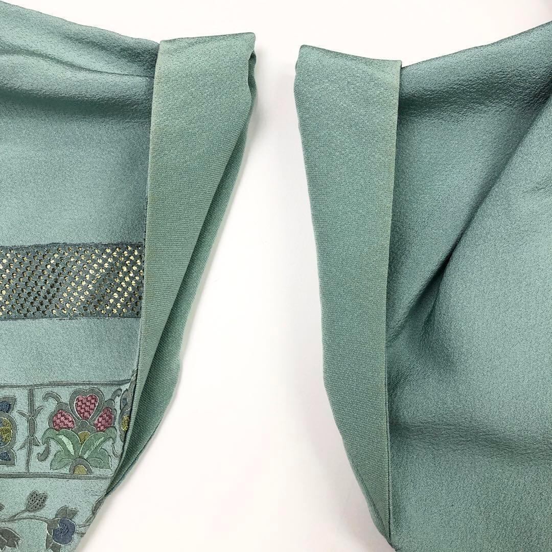 薄水色ベースのグラデーションに相良刺繍、汕頭刺繍などでデザインされた花唐草模様の総刺繍柄の素敵なお品でございます。