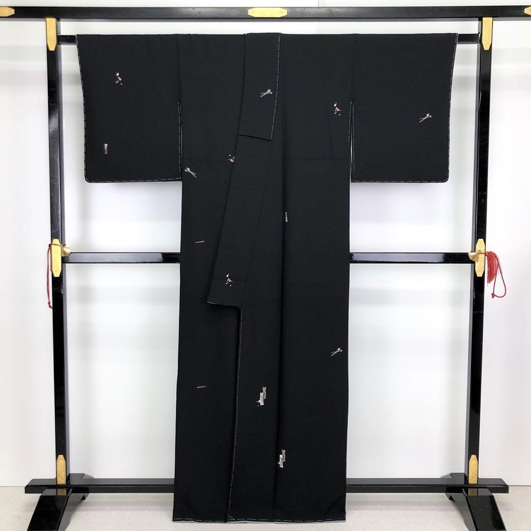 黒地の縮緬に飛び柄、一部刺繍でデザインされた瓢箪、かんざし、鹿の子模様の素敵なお品でございます。