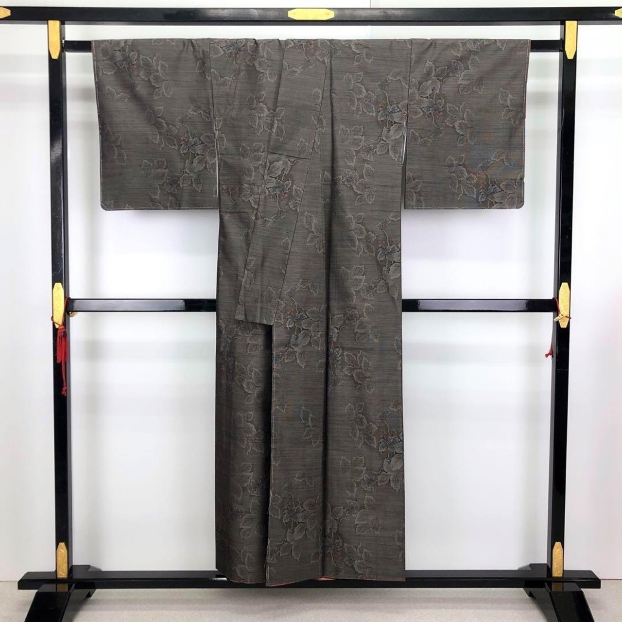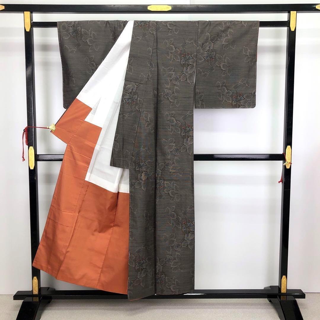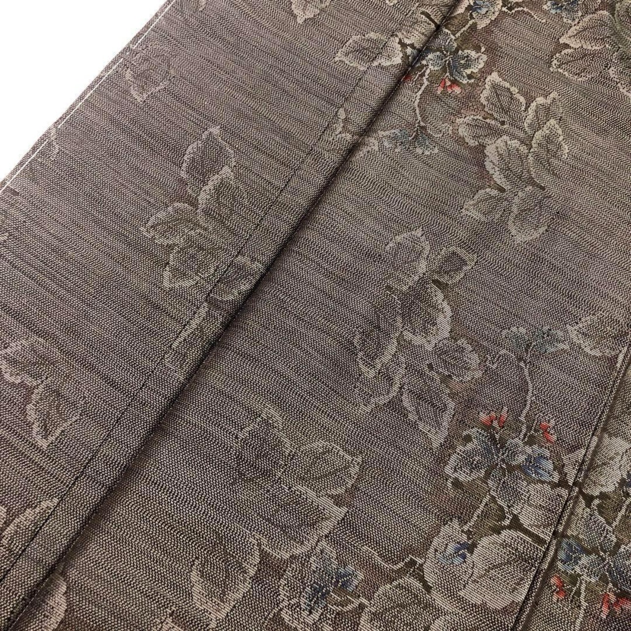 茶泥染の美しい染色に花と葉模様の横双絣の織模様がデザインされた素敵なお品でございます。
