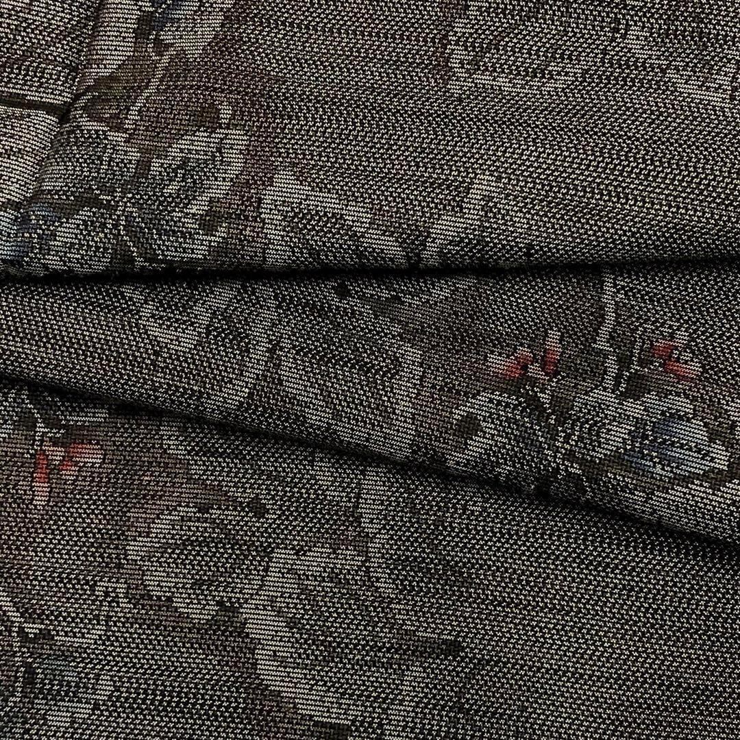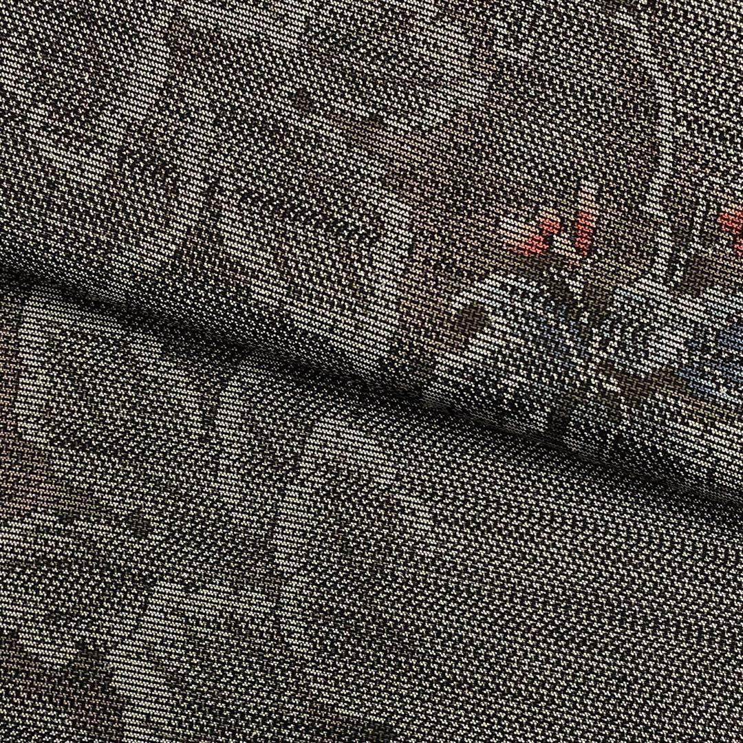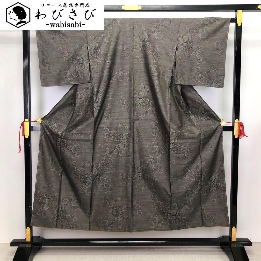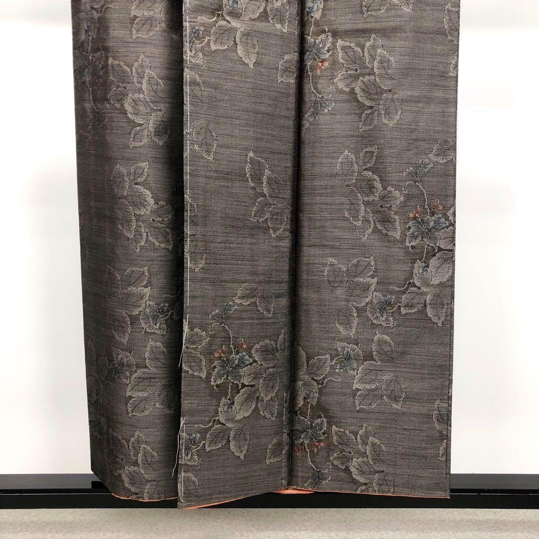 茶泥染の美しい染色に花と葉模様の横双絣の織模様がデザインされた素敵なお品でございます。