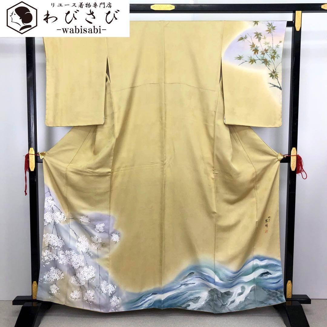 窃黄色のお色味の上質な縮緬に手描きでデザインされた波模様、紅葉に桜の花が美しい素敵なお品でございます。