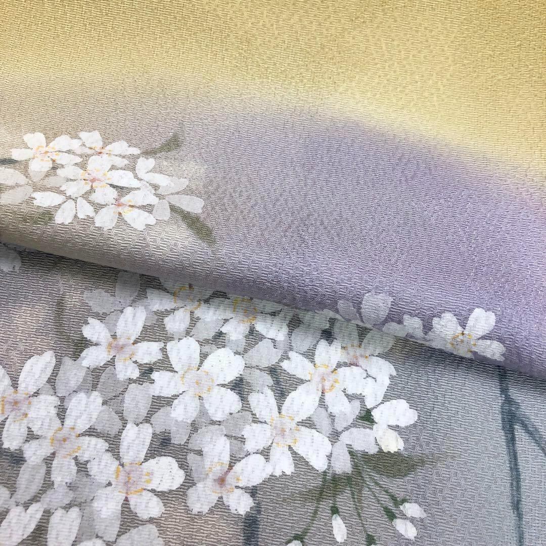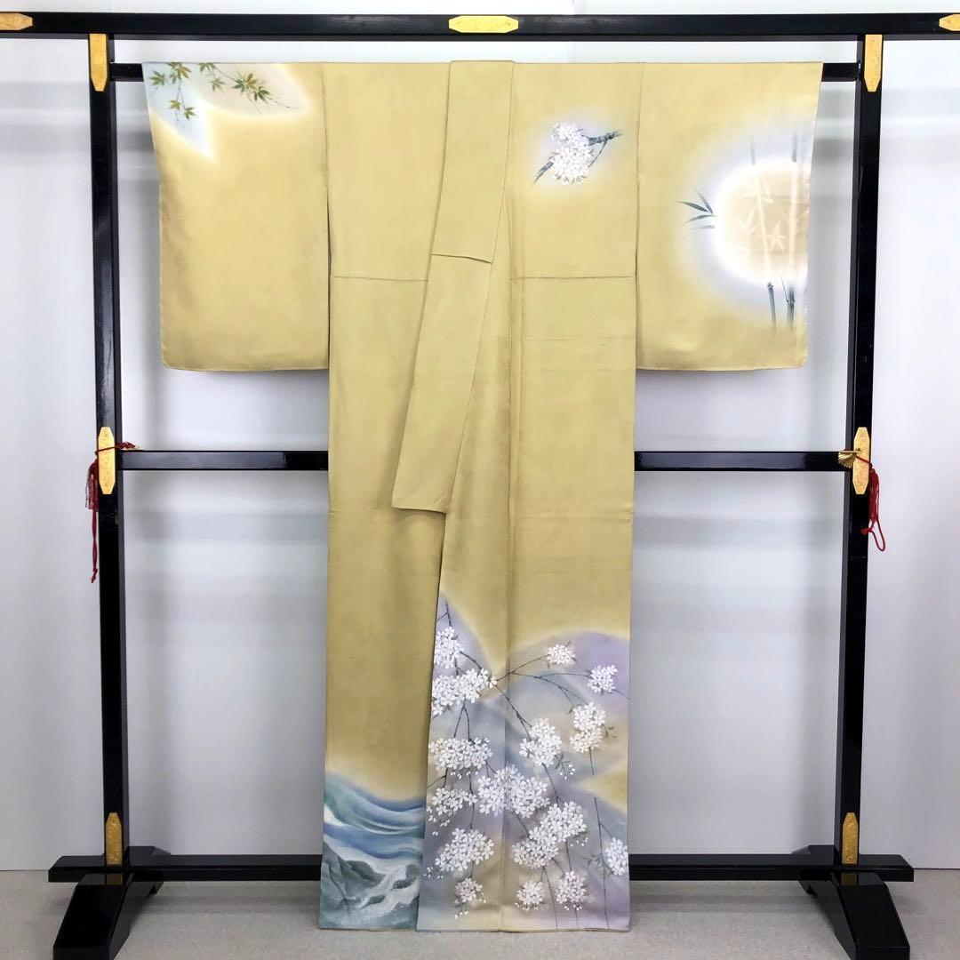 訪問着 作家物 紫峰 桜の花 波模様 窃黄色 トールサイズ K-2962