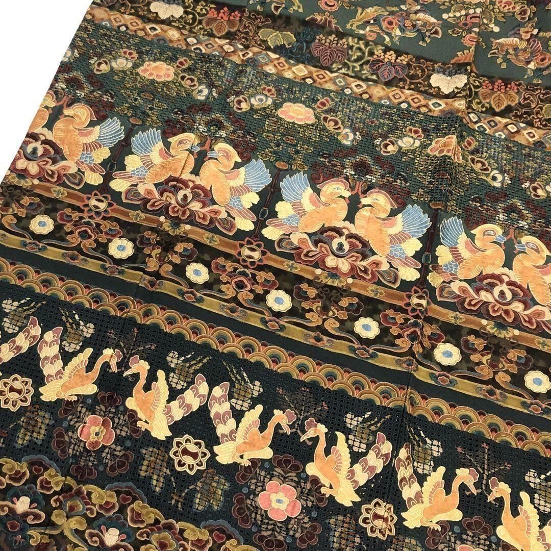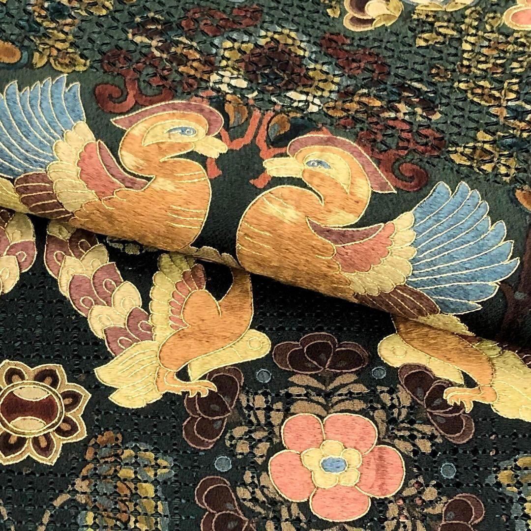 黒橡色ベースの濃い緑色ベースの高級感のあるお色味に全ての柄裄が汕頭刺繍、蘇州刺繍でデザインされた圧巻の刺繍柄で花鳥模様のオリエンタルで美しい柄裄の極上のお品でございます。