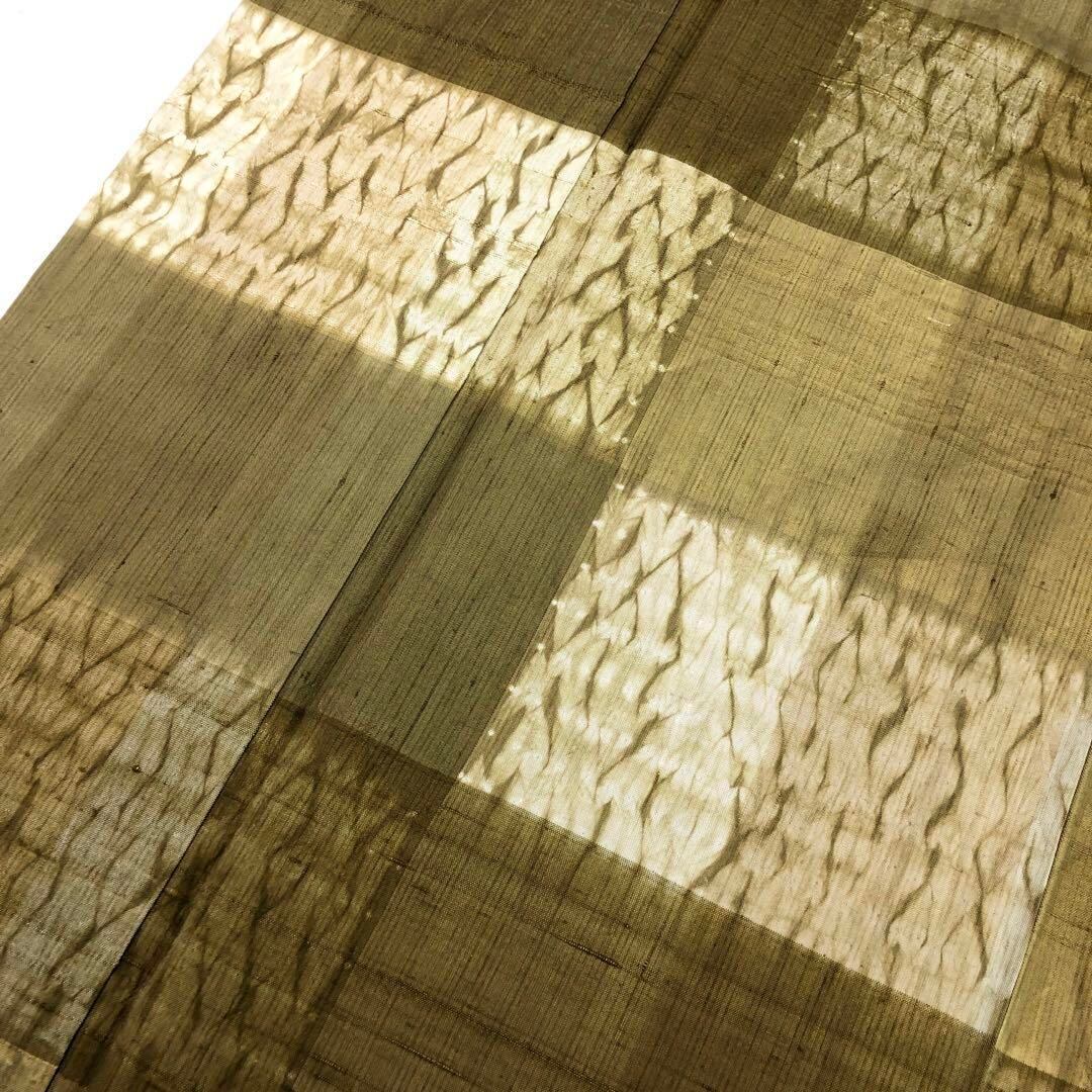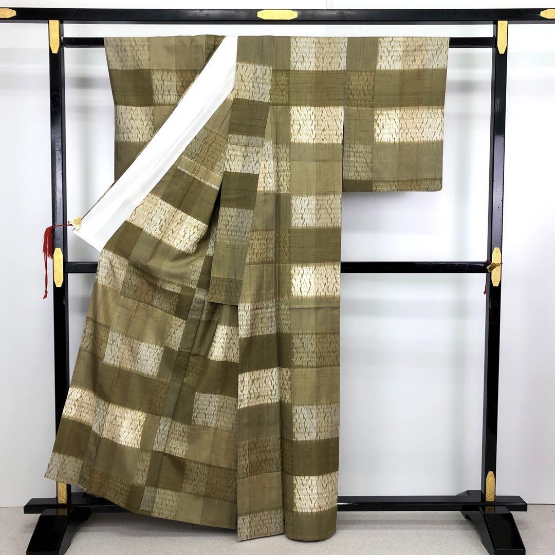 単衣 紬着物 格子柄に絞り模様 樹皮色 K-2991